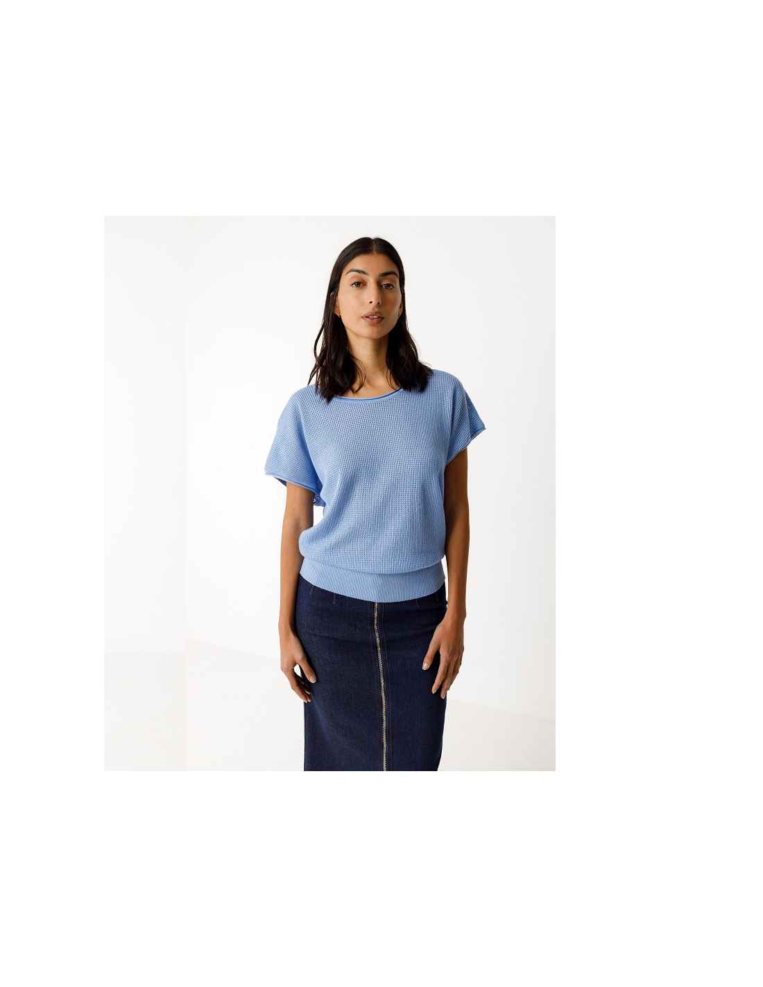 - Détails du produit : pull en tricot de coton bio, manches courtes, large bordure à côtes à la taille.
