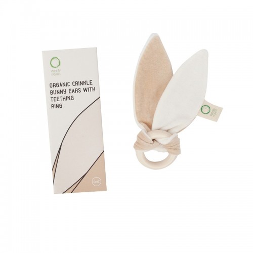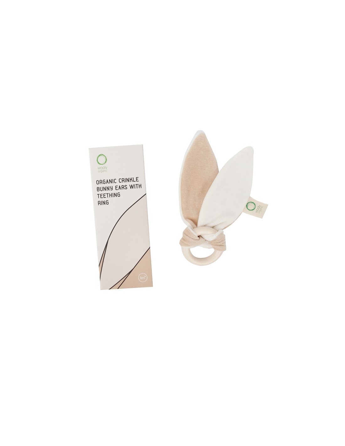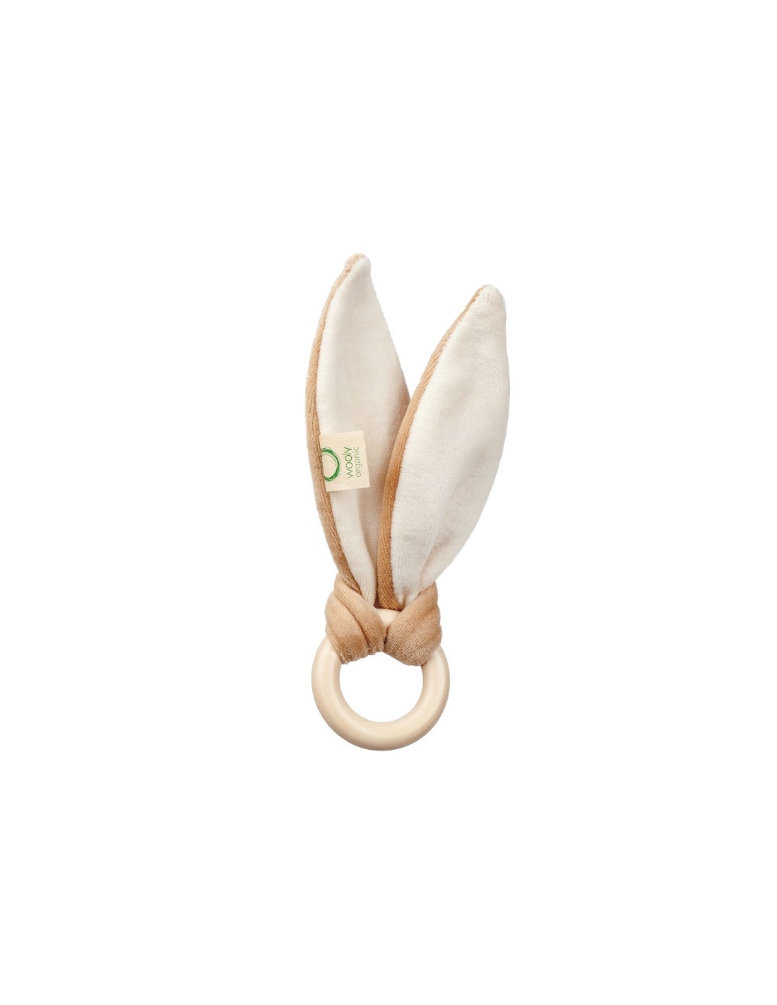 Oreilles de lapin en coton bio et anneau de dentition en bois.