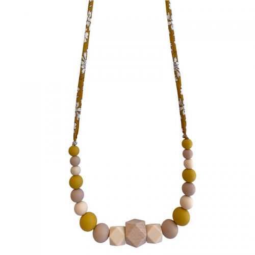Collier d'allaitement ou de portage Capucine, perles en bois et silicone alimentaire.