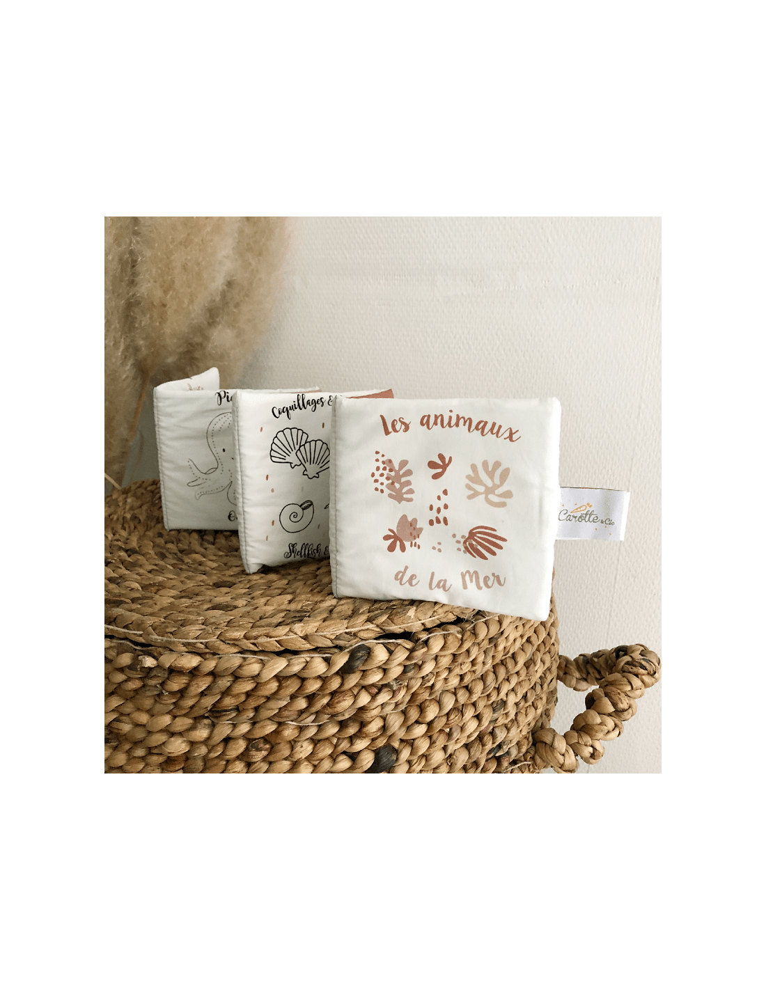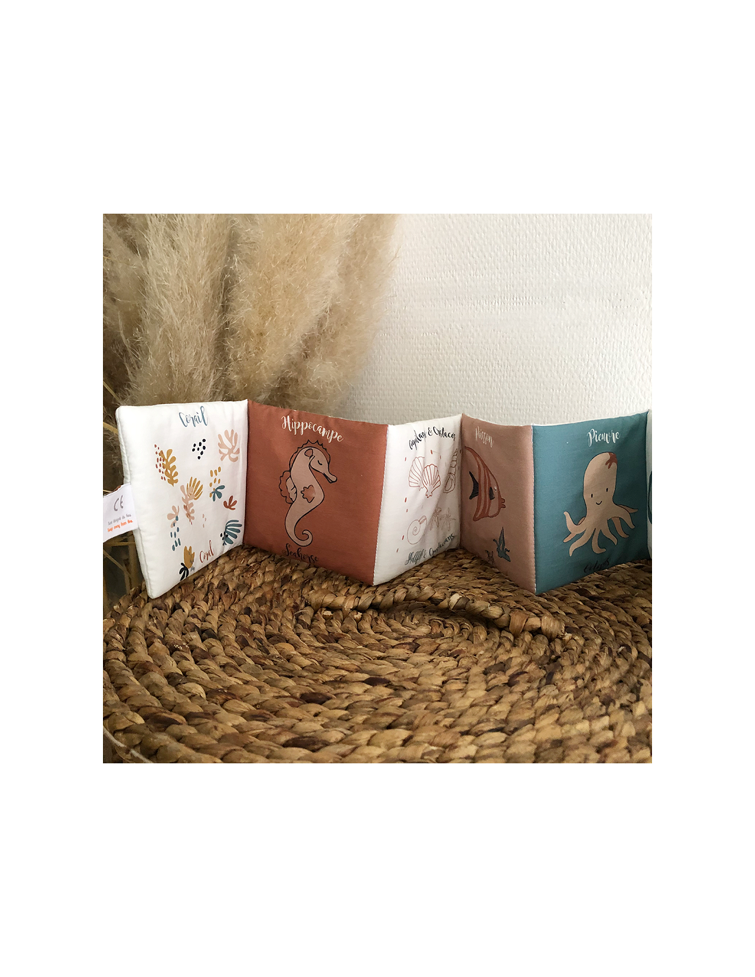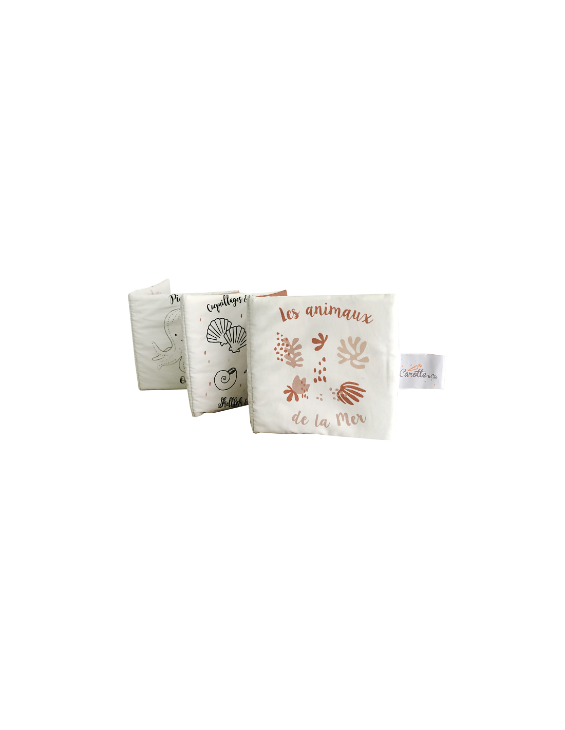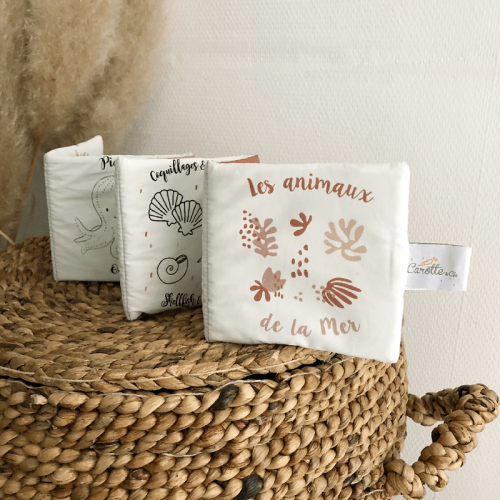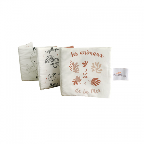 Livre d'éveil Animaux de la mer en coton biologique, pour les premières découvertes de bébé.