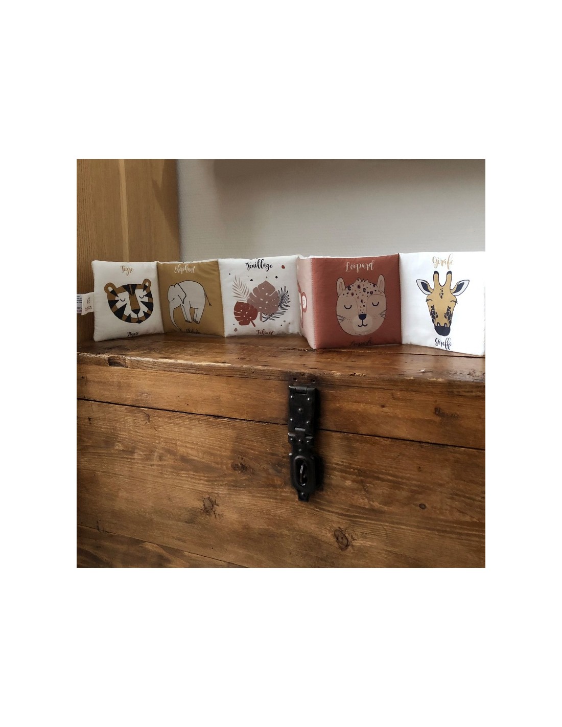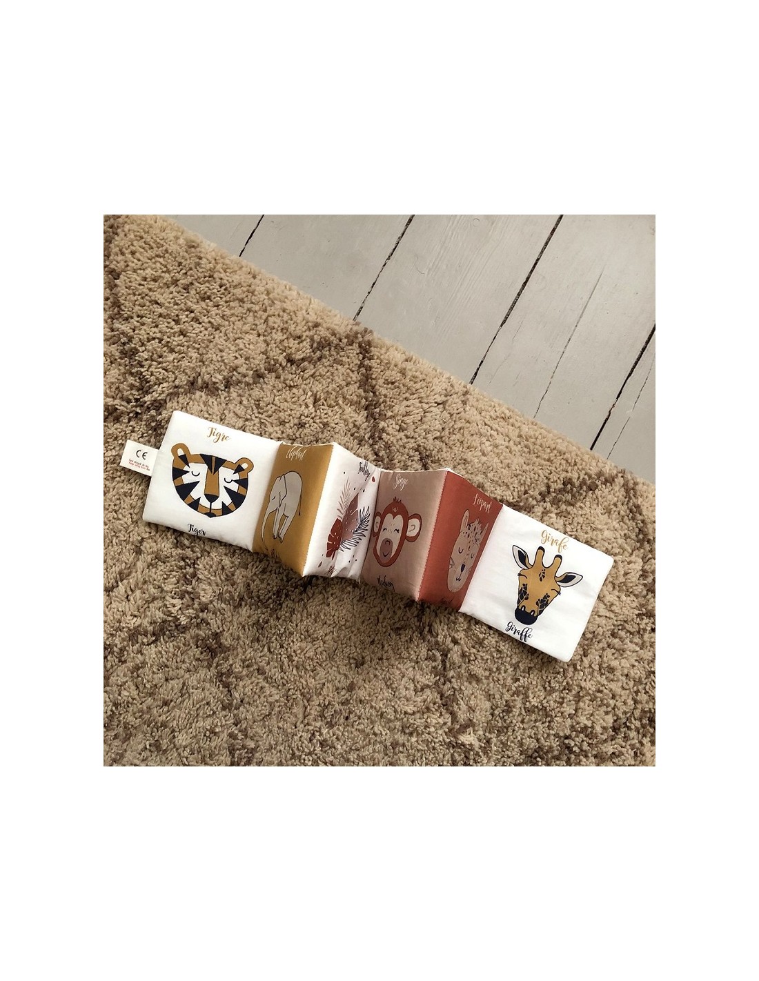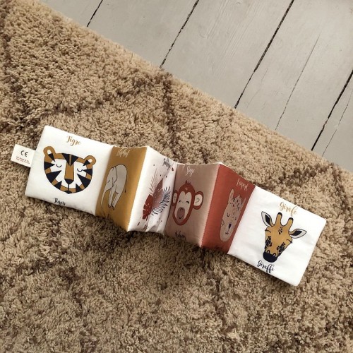 Livre d'éveil Animaux de la savane en coton biologique pour les premières découvertes de bébé.