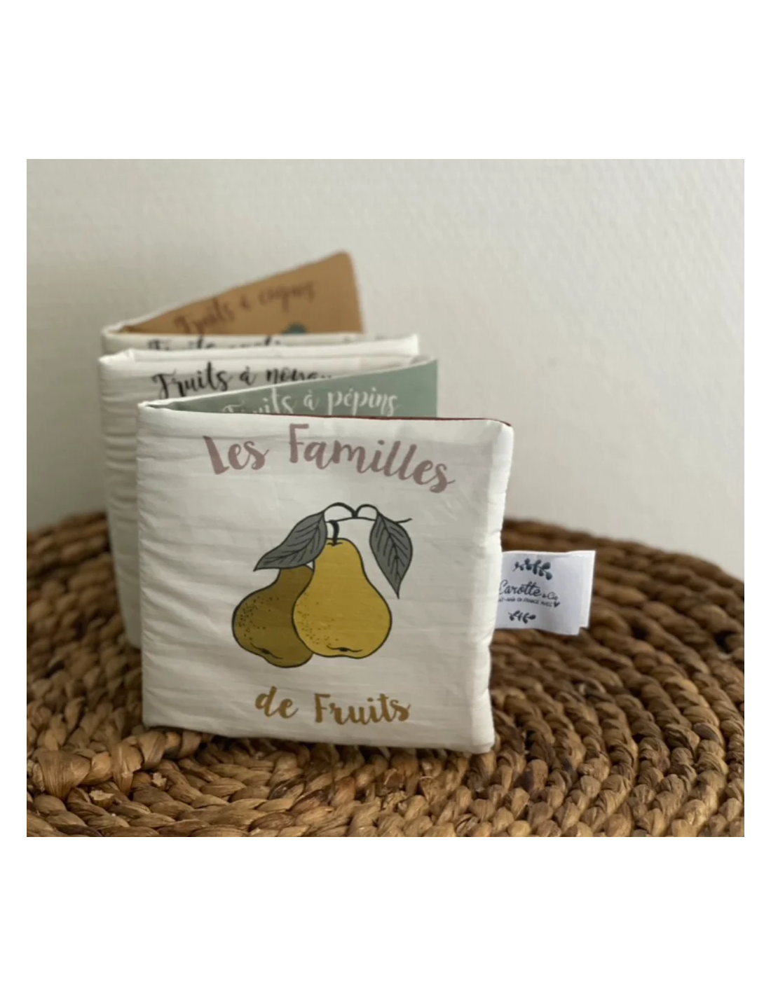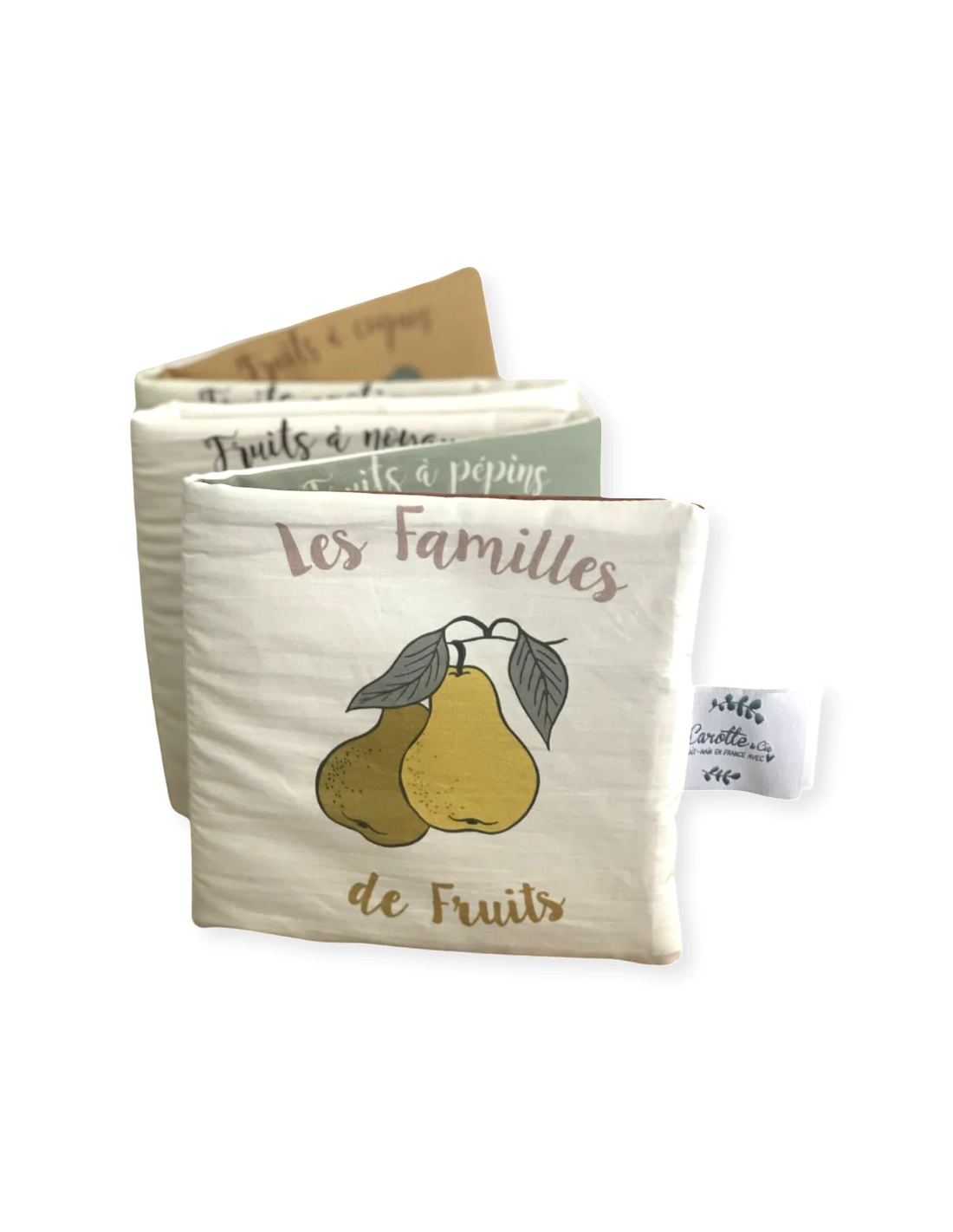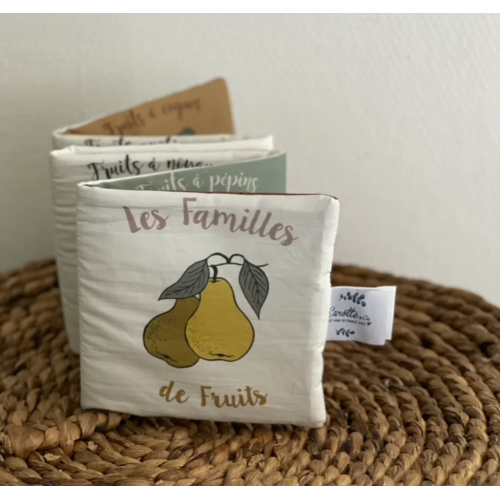 Ce livre d'éveil Fruits Carotte & cie en tissu de coton biologique est idéal pour éveiller la découverte sensorielle de bébé.