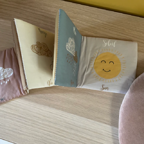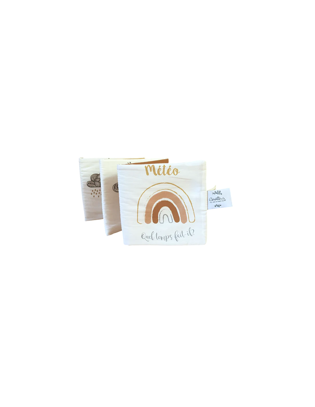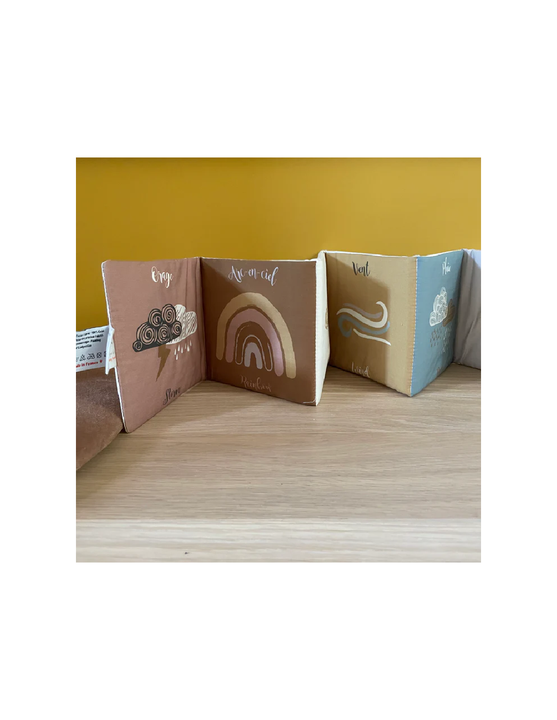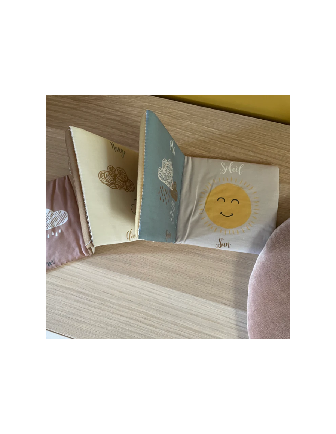 Ce livre d'éveil Météo Carotte & cie en tissu de coton biologique est idéal pour éveiller la découverte sensorielle de bébé.