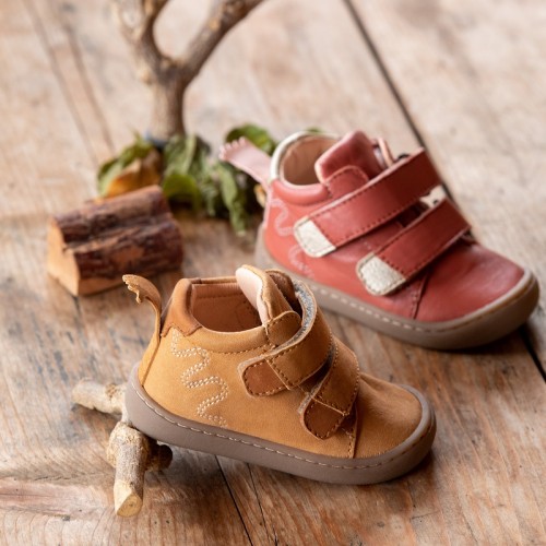Les premieres chaussures Deboo velcro camel Easy Peasy, sont adaptées pour les premiers pas de bébé à l'extérieur.