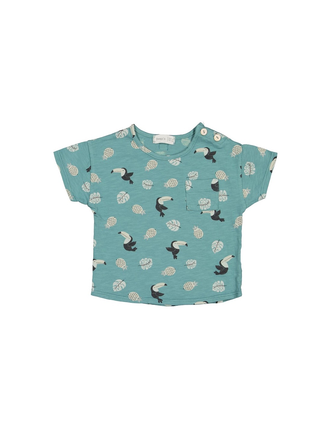 Le T shirt manches courtes vert motif Toucan Bean's Barcelona en 100 % coton biologique, complètera toutes les tenues estivales de bébé.