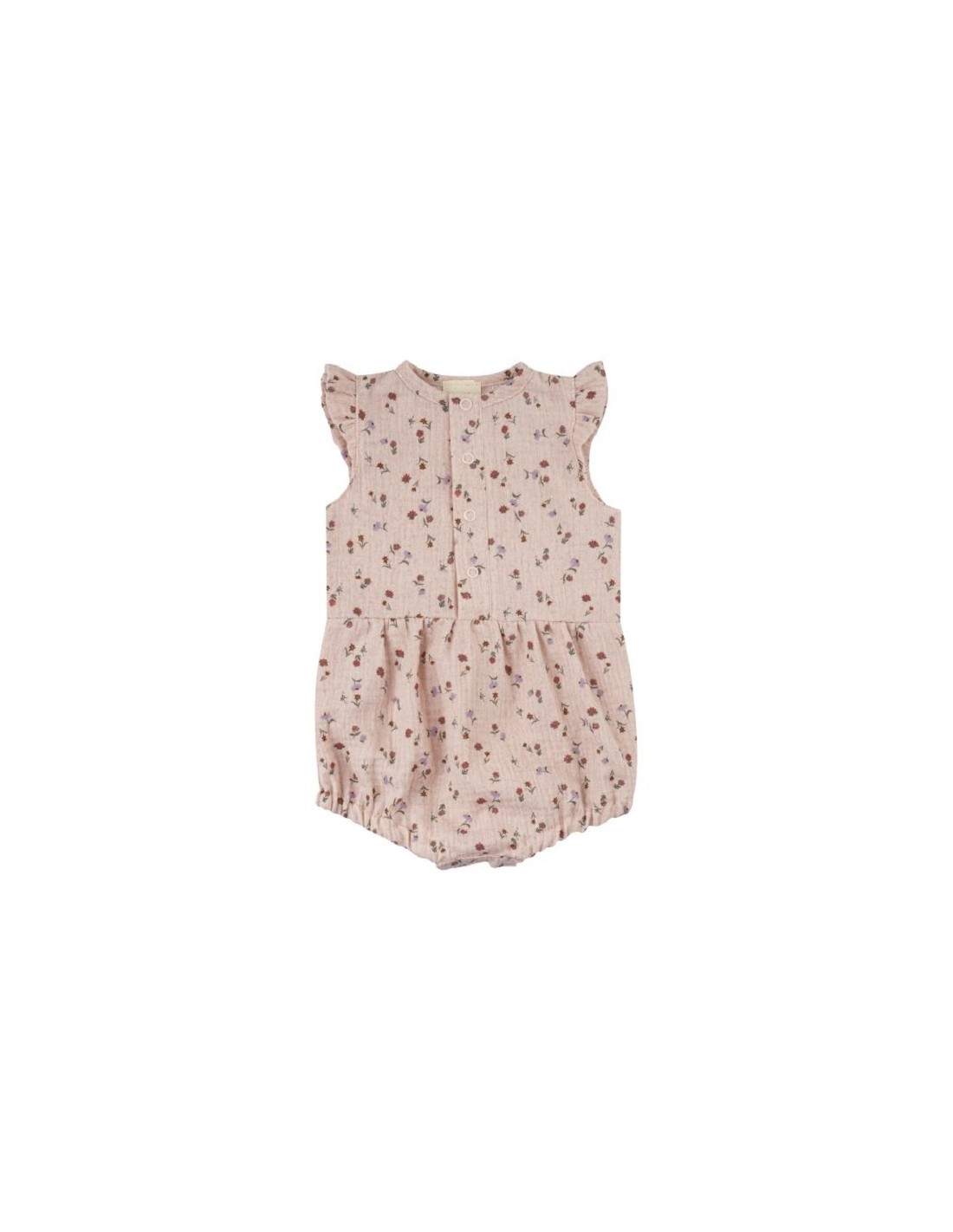 Cette barboteuse rose imprimé fleuri Wooly organic est fabriquée en mousseline de coton de qualité supérieure certifiée GOTS.
