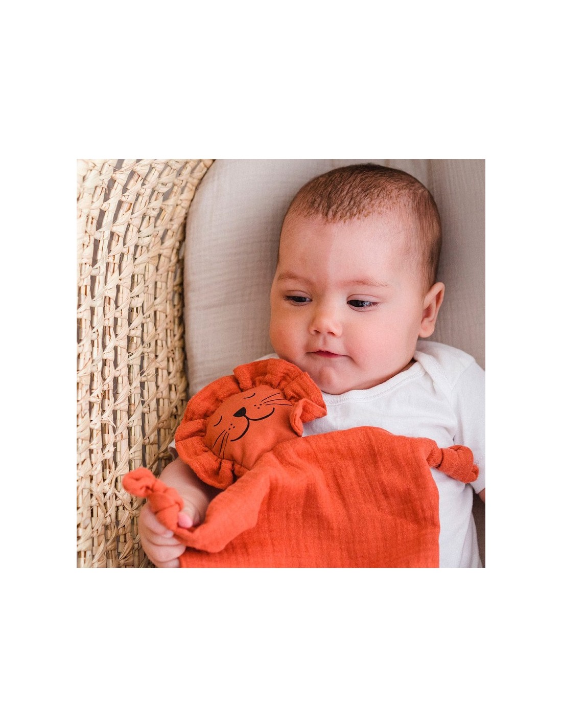 Doudou Lion en coton Bio Apunt, est rembourré en fibre de maïs au niveau de la tête.