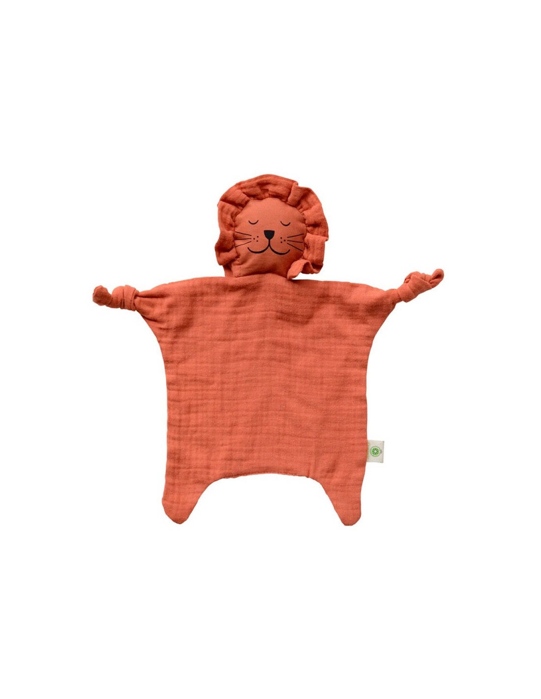 Ce doudou Lion en coton bio Apunt est certifié Gots et sa tête est rembourrée en fibre de maïs, matière végétale.