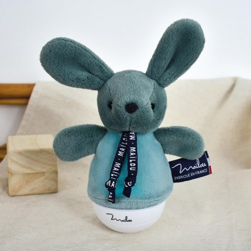 La veilleuse dorlotin musicale culbuto Lapin vert concentre trois fonctions essentielles pour le bien-être nocturne de bébé : veilleuse multicolore de 16 cm, boîte à musique relaxante et culbuto ludique.