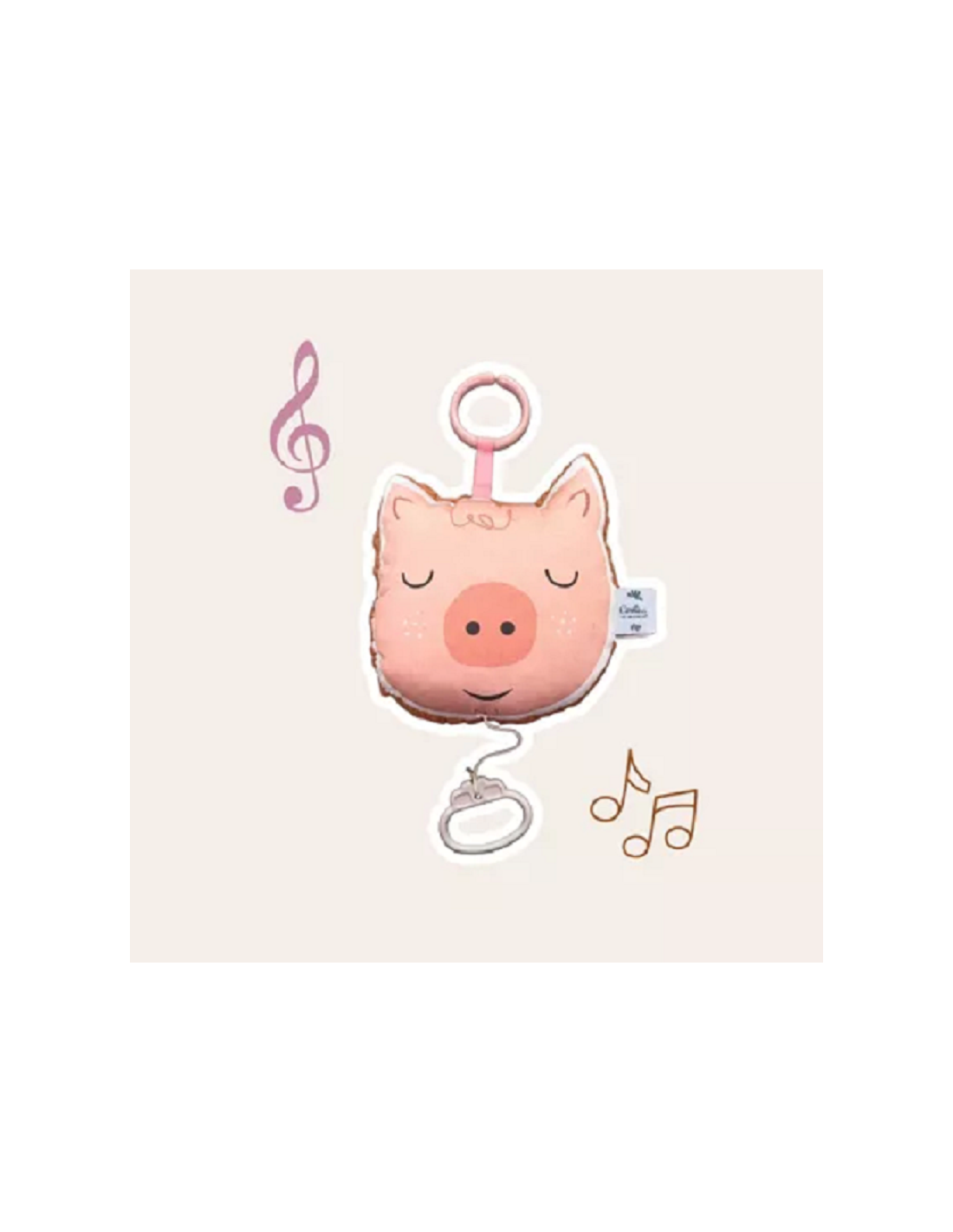 Ce mini coussin musical cochon rose Carotte & cie en tissu de coton biologique est idéal pour éveiller bébé lors des premiers mois.