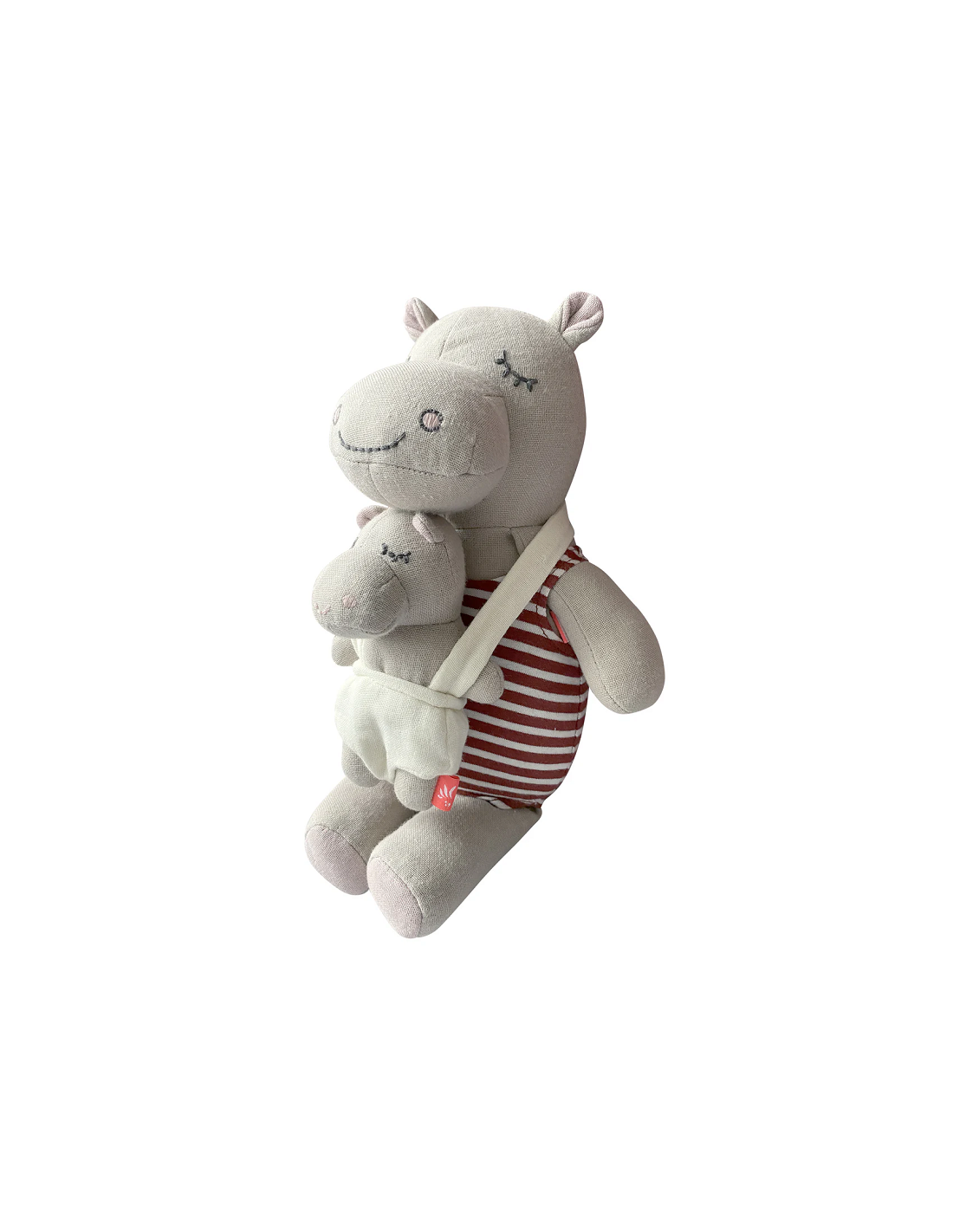 Elle représente une maman hippopotame portant son bébé en porte bébé. (les vêtements et le porte bébé sont amovibles)