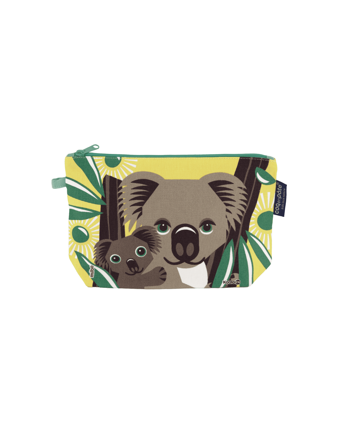 La trousse à crayons Koala jaune Coq en pâte est 100% confectionnée en coton biologique, imprimé recto verso.