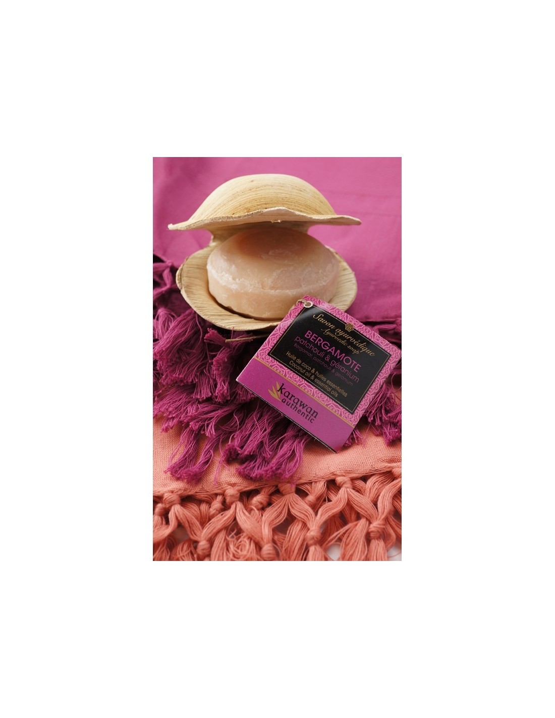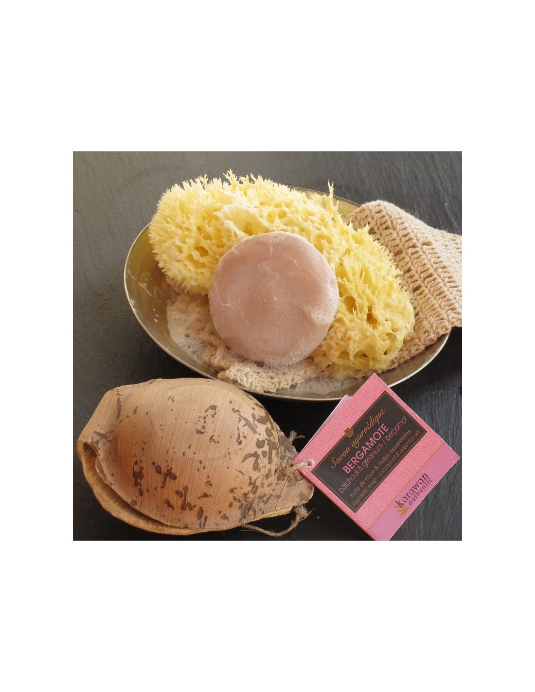 Savon ayurvédique à l'huile de noix de coco (100g), regénérant, à base de bergamote, de patchouli, et de géranium, dans une coque végétale (porte savon).