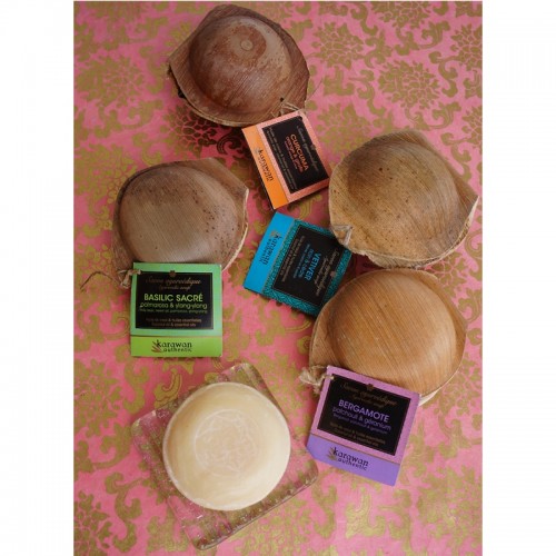 Les savons sont conditionnés dans une feuille de palmier séchée et moulée et pourra être utilisée comme porte-savon.