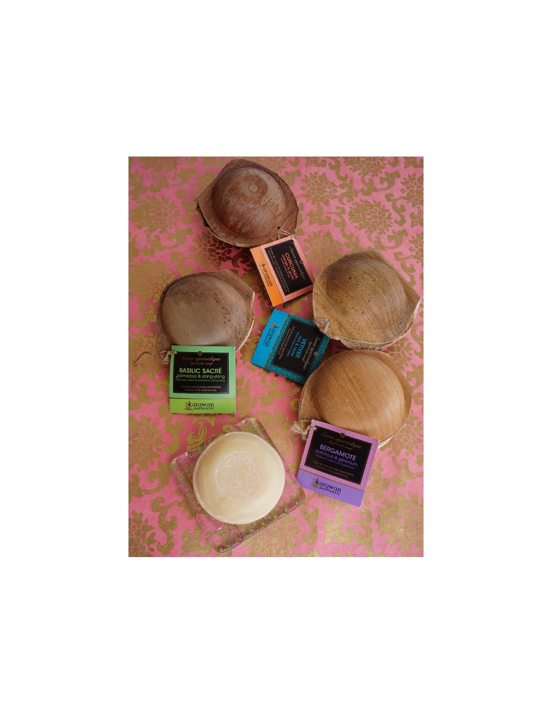 Huile de coco pressée à froid, huiles essentielles et synergies de plantes, toutes les vertus de l'Ayurvéda dans un savon hérité de la médecine indienne.