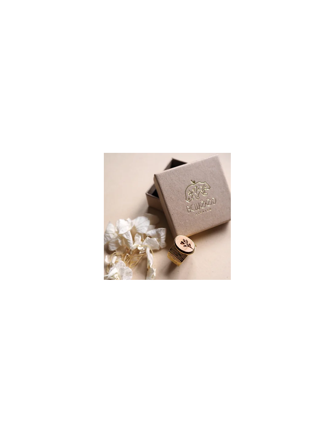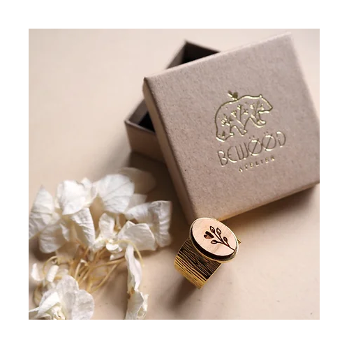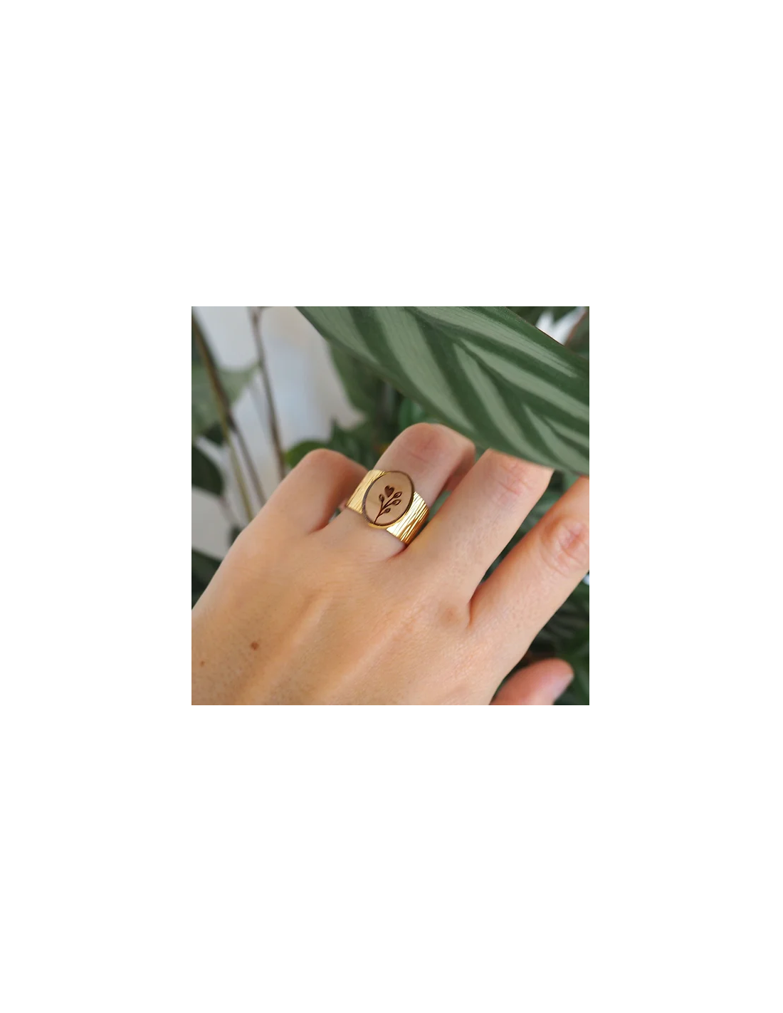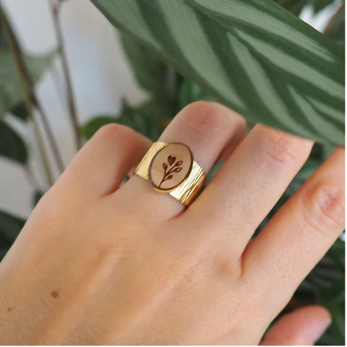 La bague chevalière en bois et acier doré, gravée de feuilles ornées d'un coeur, de l'atelier Bewood, est fabriquée en France par Laury.