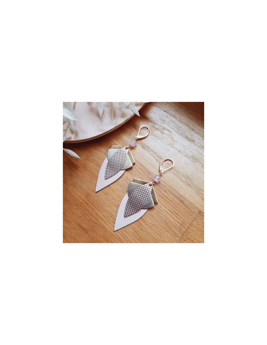 Les boucles d'oreilles GRAND LOTUS rose Ni une ni deux sont de très belles boucles pendantes en cuir et pierre semi précieuse de quartz rose. Elles sont très légères, agréable à porter et très élégantes !