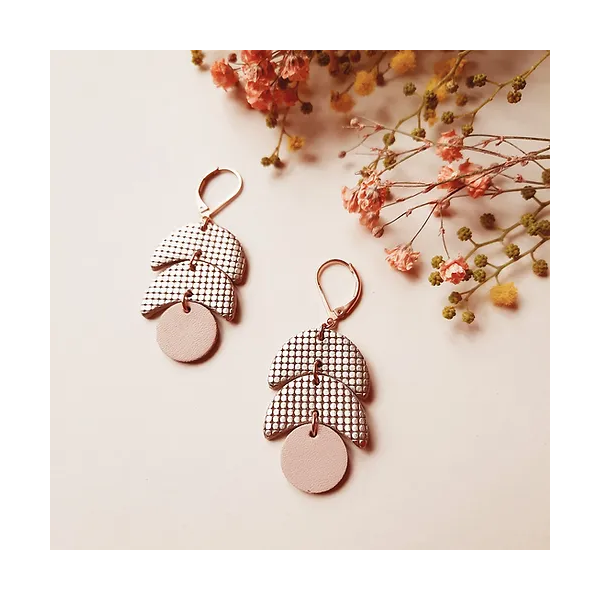 Les boucles d'oreilles calder rose Ni Une Ni Deux sont des boucles d'oreilles pendantes en cuir recyclé, très agréables à porter de part leur légèreté. Vous apprécierez leur look original et u peu art déco !