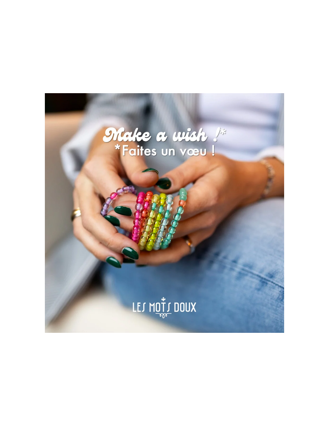 Le bracelet make a wish vert anis et vert Les Mots Doux est un bracelet pour chuchoter son souhait à la 13ème perle de ce bracelet. Fermez les yeux et laissez la magie opérer ! Vous verrez, ça fonctionne 😊