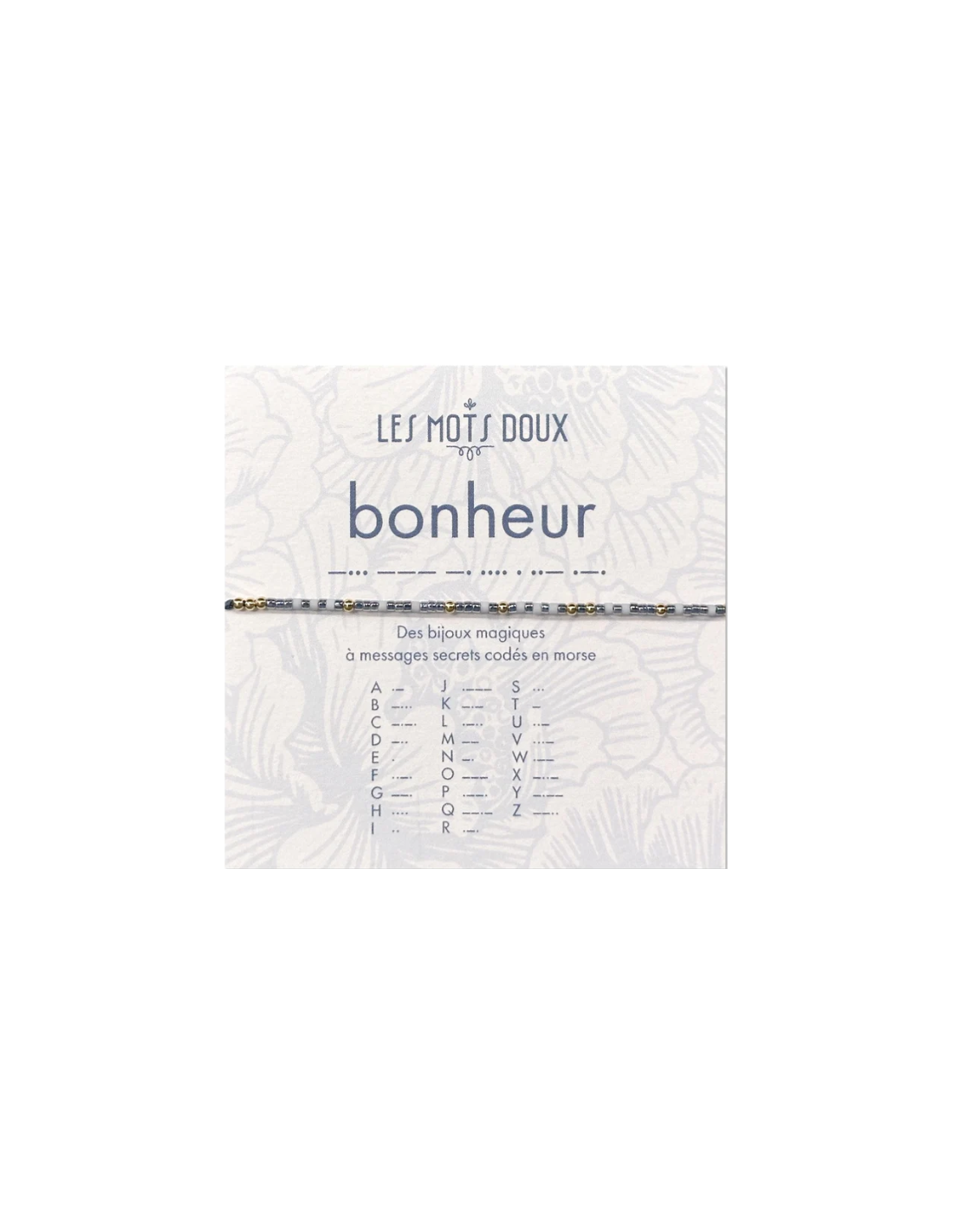 Le bracelet lien code morse bonheur or Les Mots Doux est un bracelet lien ajustable fin dont les perles reprennent le code de l’alphabet morse pour traduire un message secret dont seul le propriétaire en connait la signification. Le mot secret est ici : bonheur.