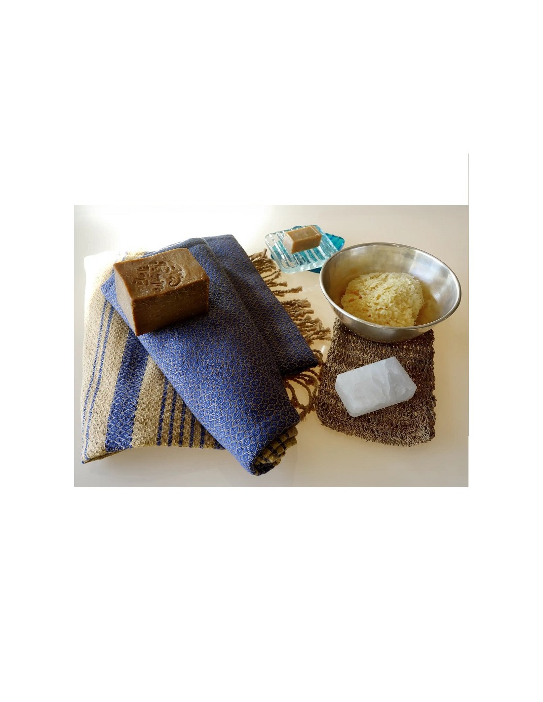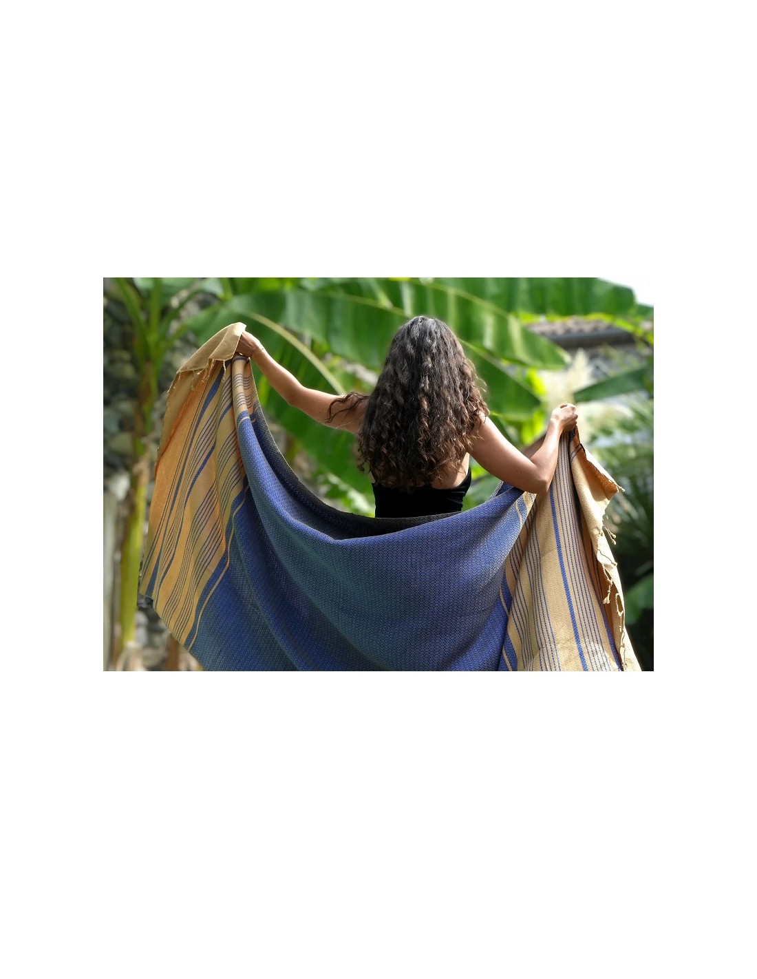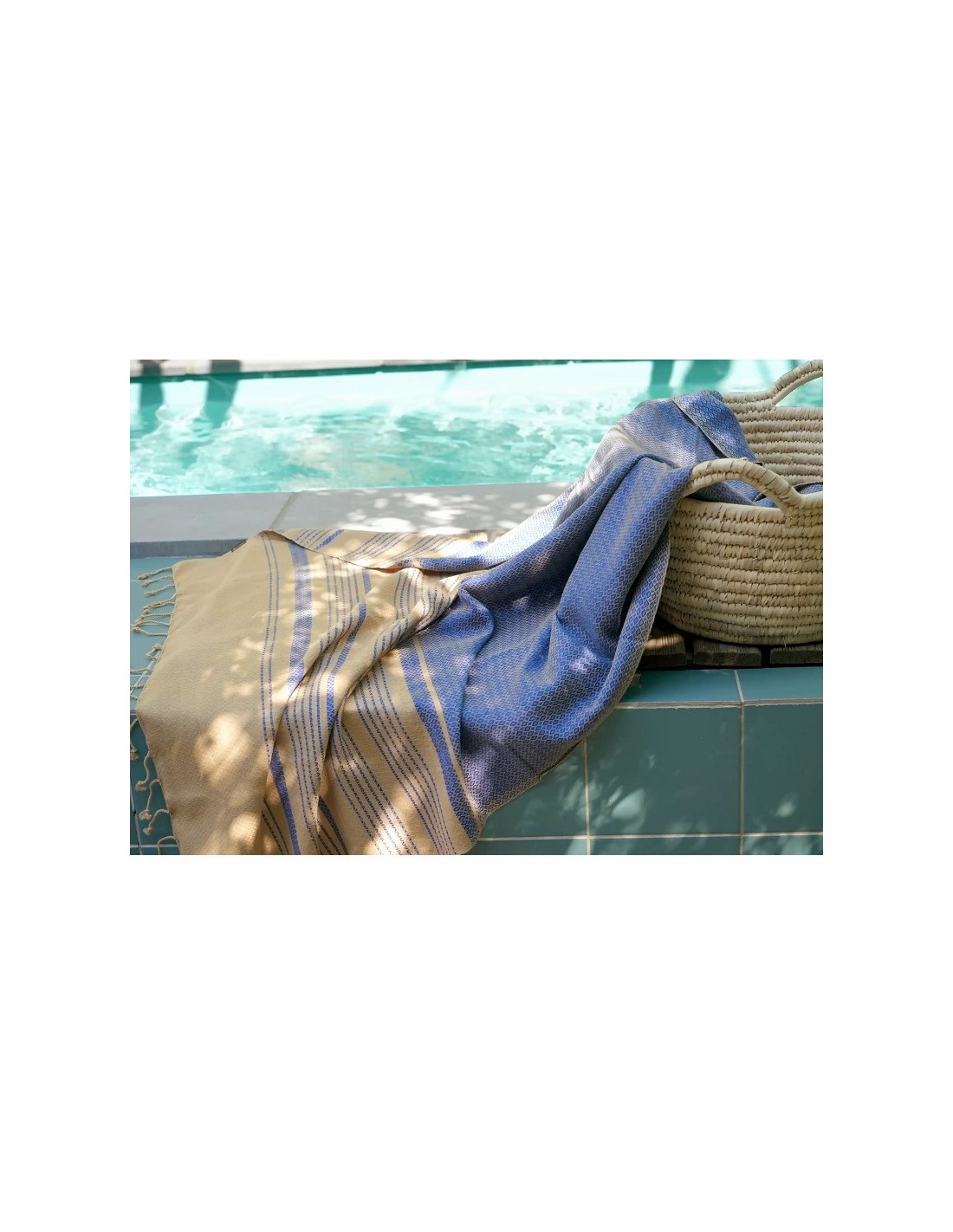 La fouta coton bio sand sable bleu imperial Karawan Authentic est une fouta que vous pourrez facilement emporter pour aller au Hammam, voyager, l'utiliser en plaid, en paréo,... L'objet essentiel des vacances !