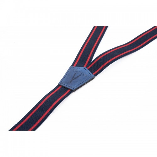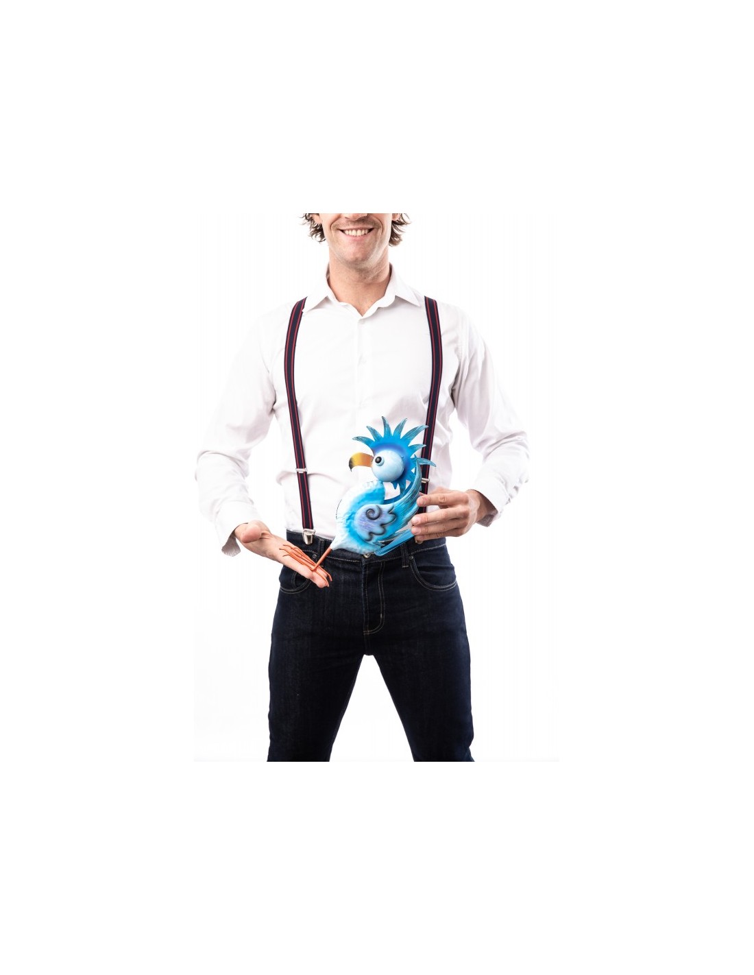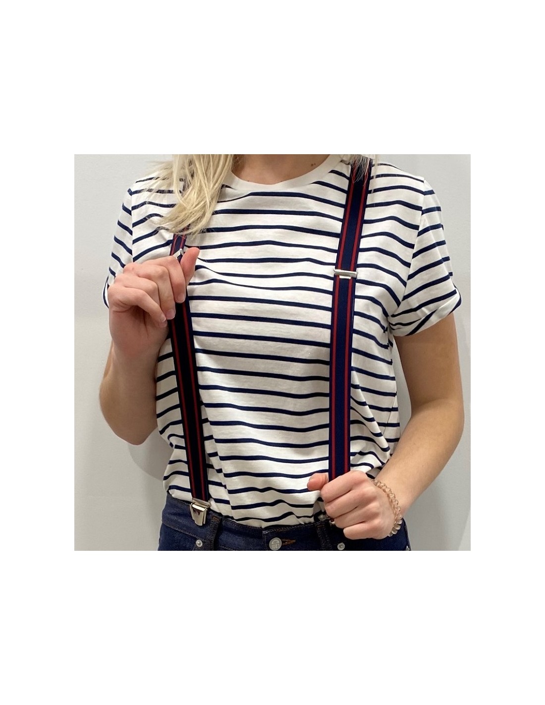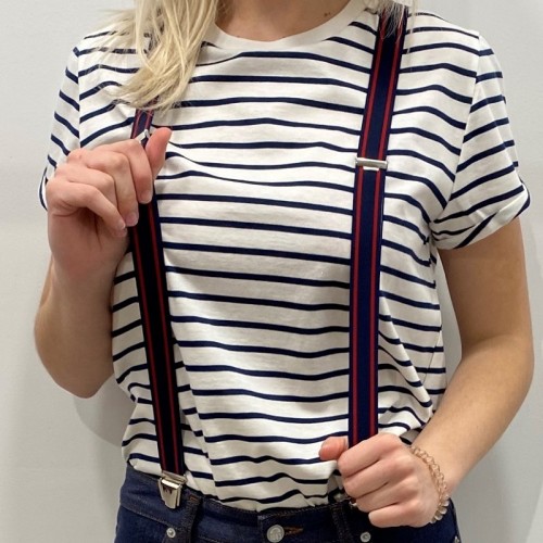Ces bretelles bleues et rouges sont à porter sur une chemise blanche, et avec un pantalon noir ou un petit bermuda beige selon la saison.