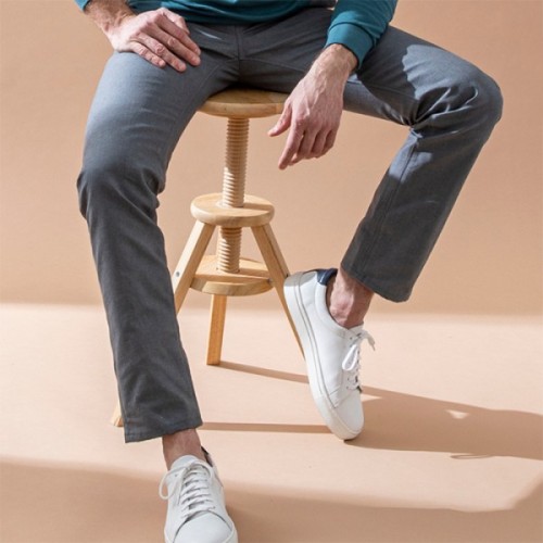 Pantalon chino, style jeans mais en gris, en coton biologique et fabriqué en France.