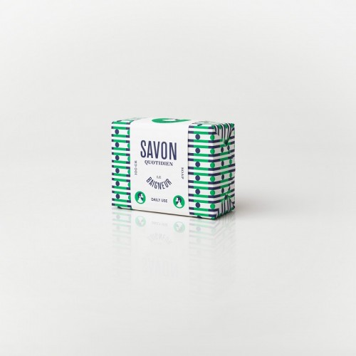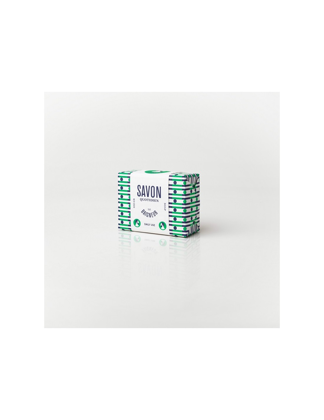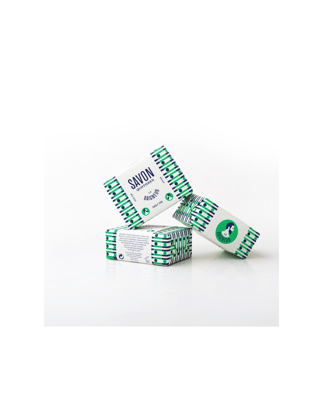 Savon quotidien de 100g, fabriqué artisanalement par Fabien à Paris dans son atelier, à base d'huile de tournesol et d'huiles essentielles méditerranéennes (minium 85% des ingrédients sont issus de l'agriculture biologique).