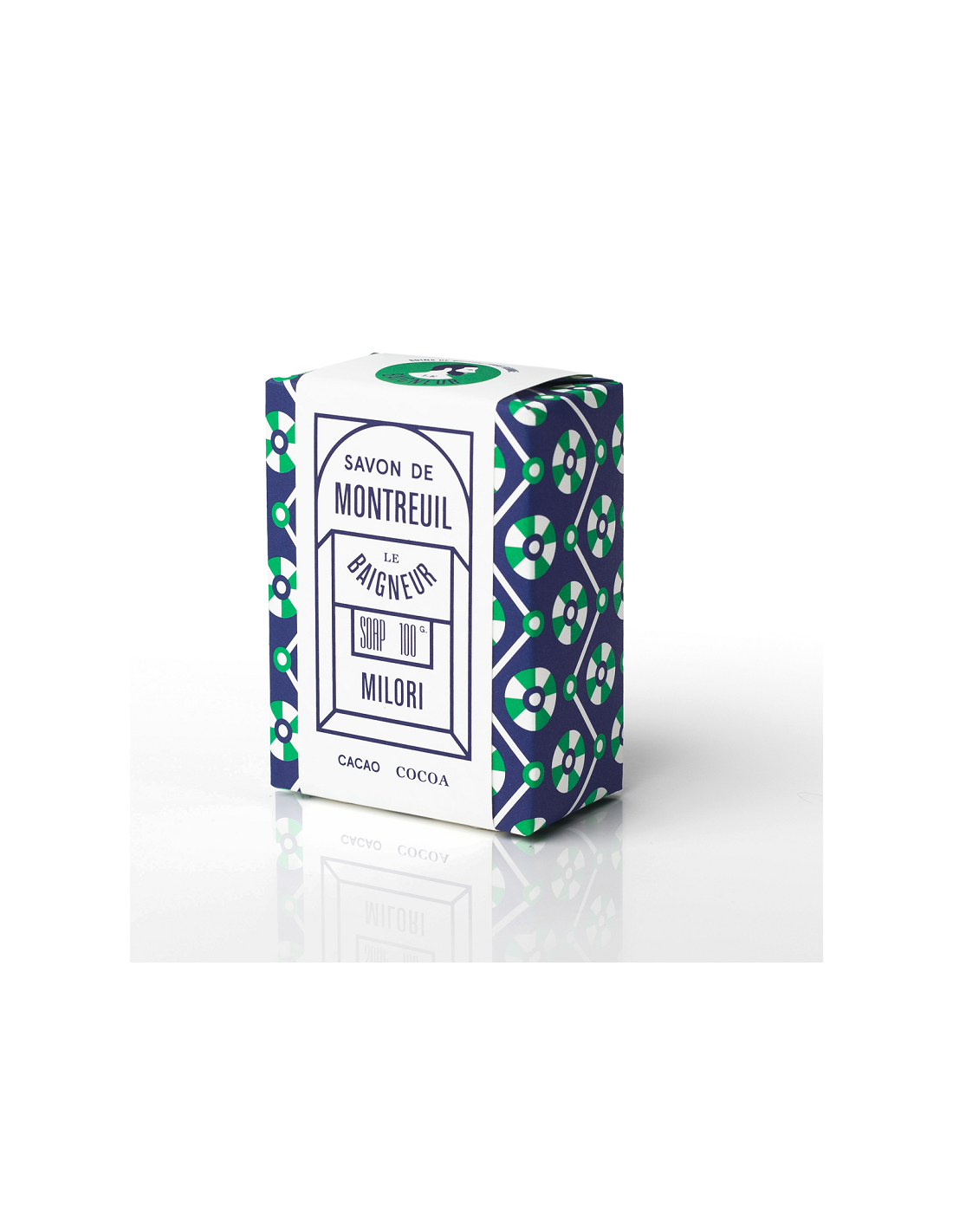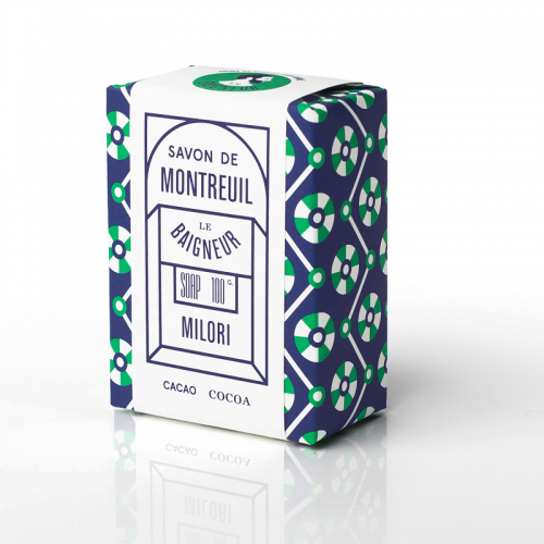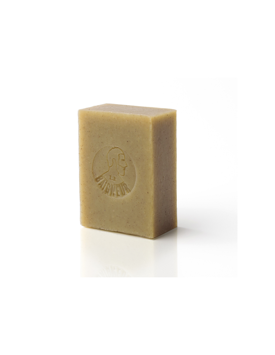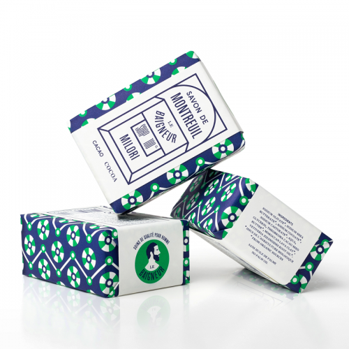 Savon fabriqué en France (100g), à base de beurre de cacao cru, d'argile ghassoul du Maroc et d'huiles essentielles d'amyris et de pin noir (au moins 85% des produits sont issus de l'agriculture biologique).