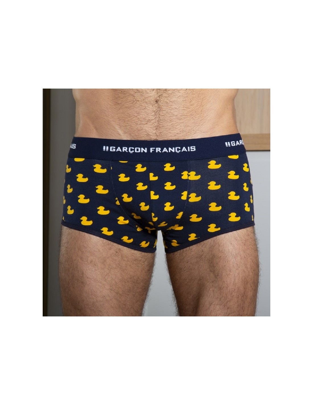 Shorty homme bleu marine canards jaunes, taille basse, coupe ajustée, fabriqué en France et en coton biologique.