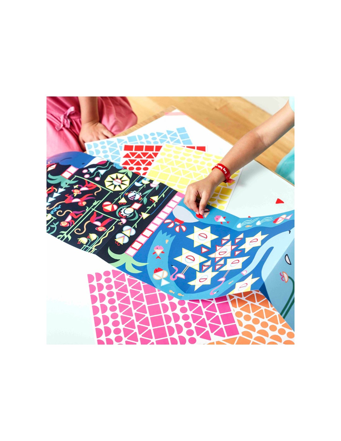 Les enfants collent les stickers sur un grand décor de jungle (éléphant, signes, tigre…). Ils s’entraînent ainsi à reconnaître les formes et les couleurs comme en maternelle. Une activité facile pour s’occuper à la maison, se concentrer et s’appliquer !