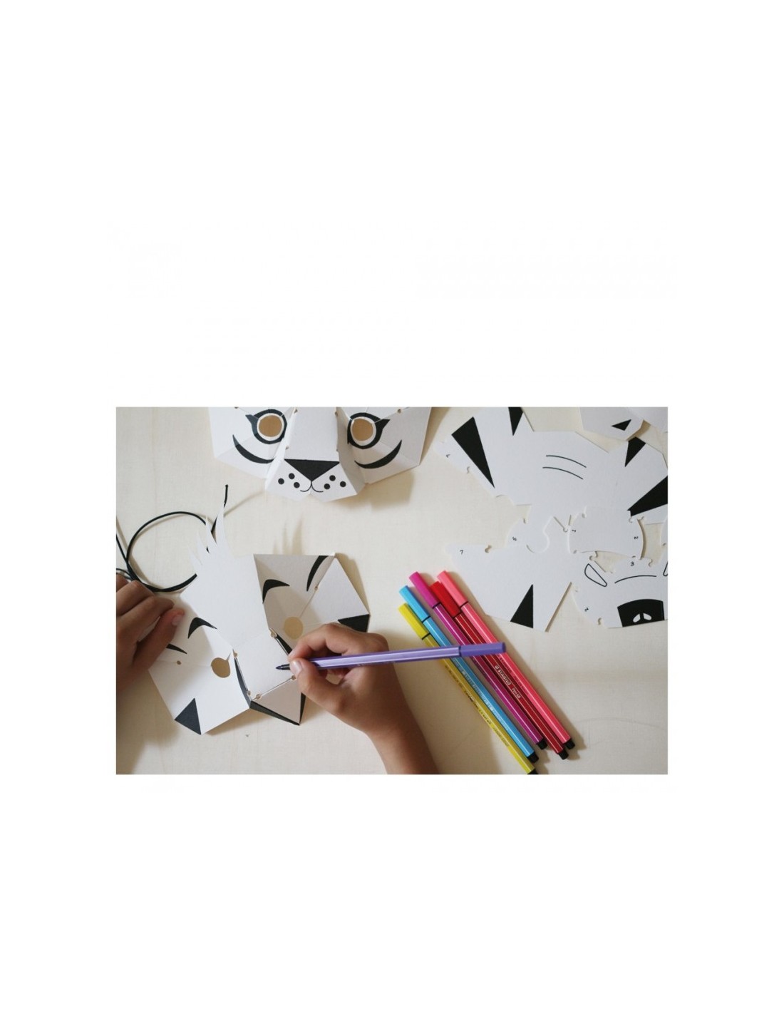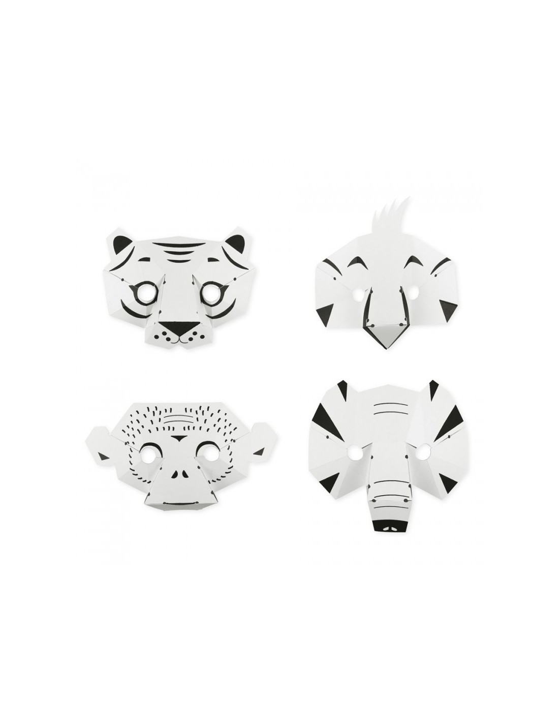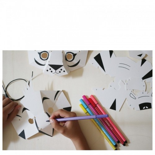 Chaque masque prend forme en assemblant le papier grâce à des élastiques (système breveté Elastiblock®). Ils sont ensuite prêts à être colorés selon son imagination !