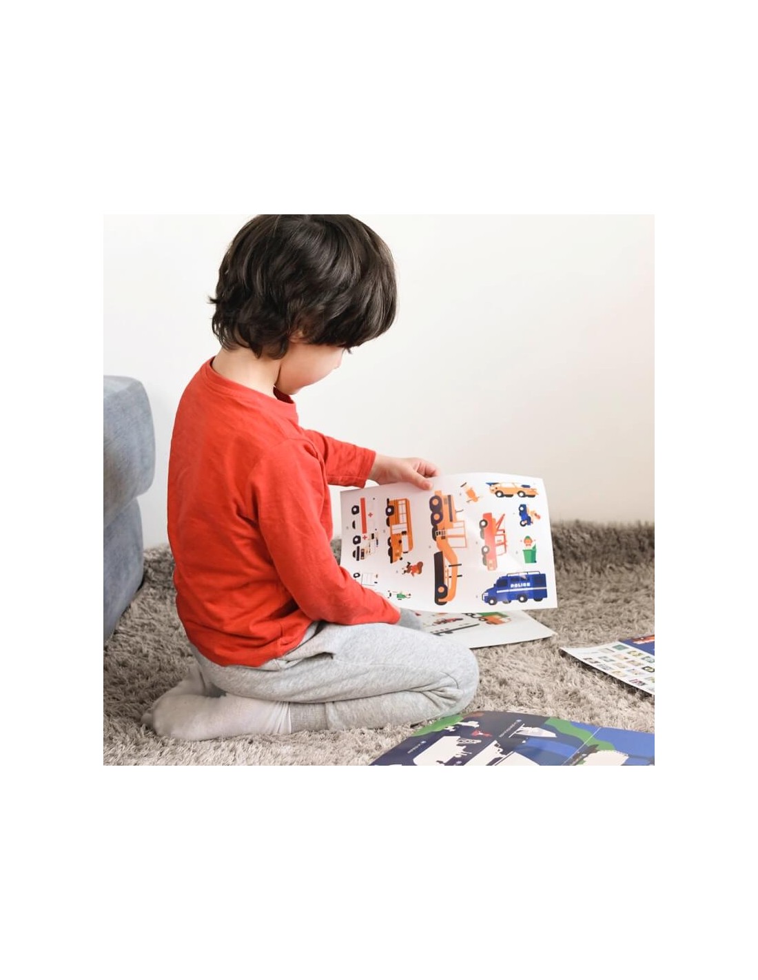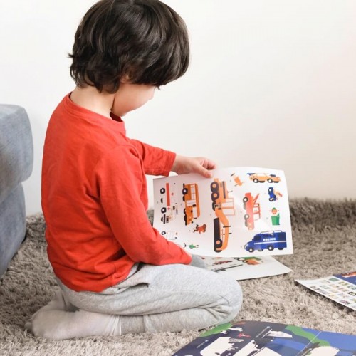 Avec ce jeu, les enfants se passionnent pour les engins de toutes sortes : hélicoptère, camions, motos, sous-marin… Les enfants collent les stickers sur le poster géant, et reconstituent ainsi un immense garage imaginaire.