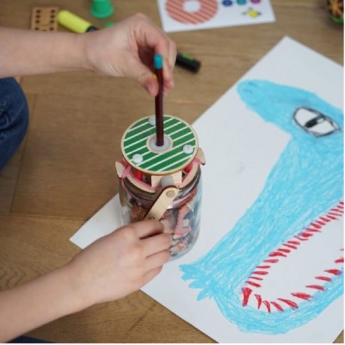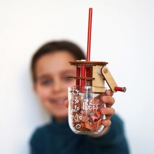 L’enfant assemble lui-même les éléments à l’aide des différents vis, joints et élastiques pour obtenir un taille-crayon vraiment unique, qui s’adapte à différentes sortes de pots en verre. Chaque étape est facile, elle est expliquée dans une notice illustrée très complète, en français et en anglais. Aucun outil n’est requis pour le montage.