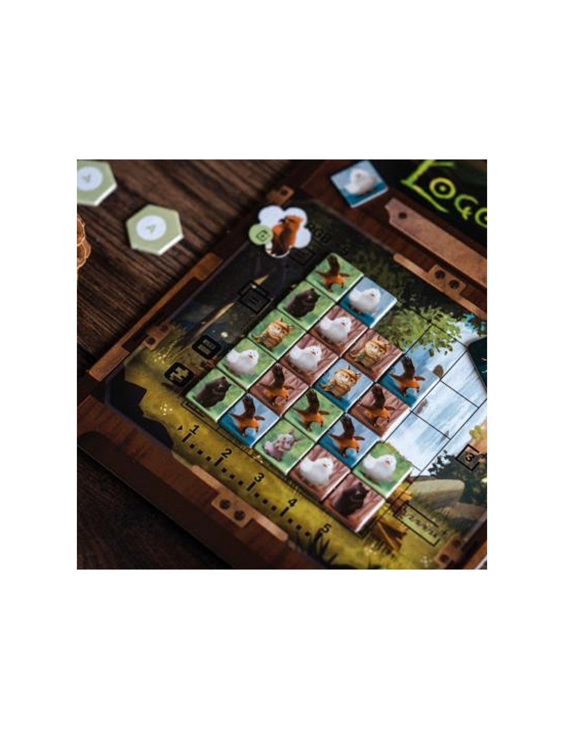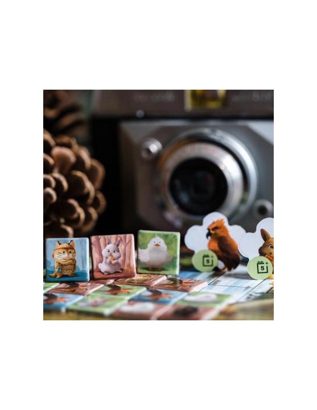 Pour récupérer des animaux, il va falloir observer attentivement le plateau central. En effet, vous allez tout d’abord déplacer un jeton animal d’une des 4 zones. Il existe 5 types d’animaux, chacun se déplaçant de manière différente. Une fois l’animal déplacé, prenez simplement en main tous les jetons de la même couleur. Vous devez ensuite les poser sur votre plateau photo. Pour cela il n’y a qu’une seule contrainte, on ne peut pas laisser d’espace vide sur la gauche.