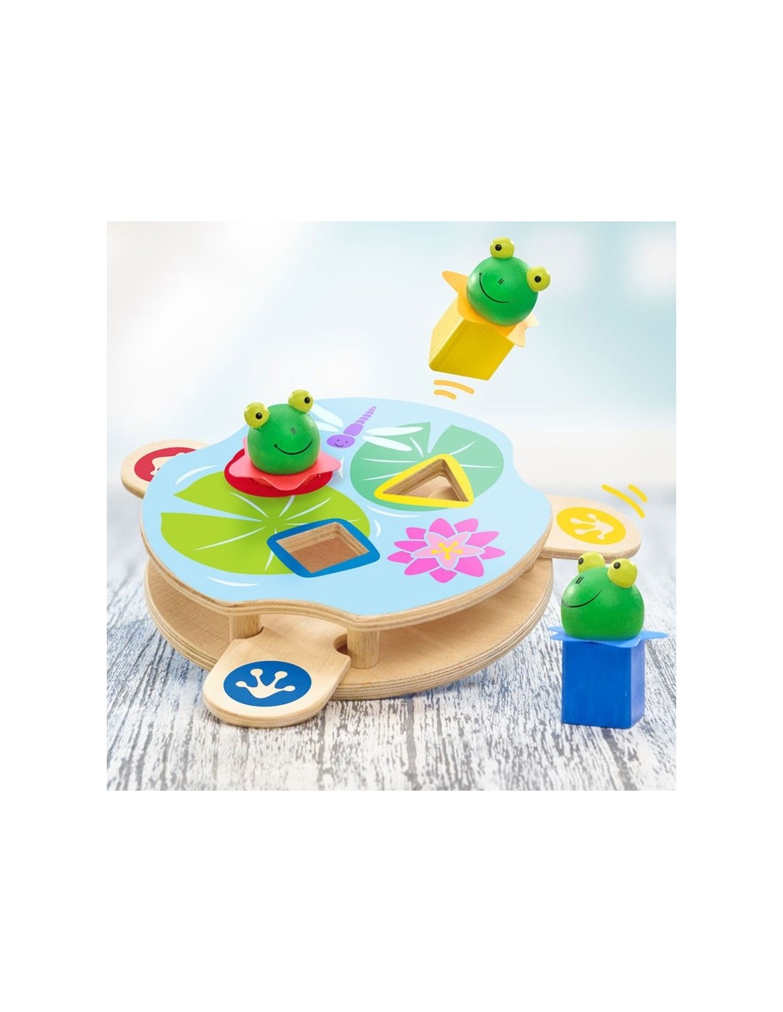 Les trois grenouilles peuvent être triées par couleur et par forme et rangées dans les ouvertures appropriées.