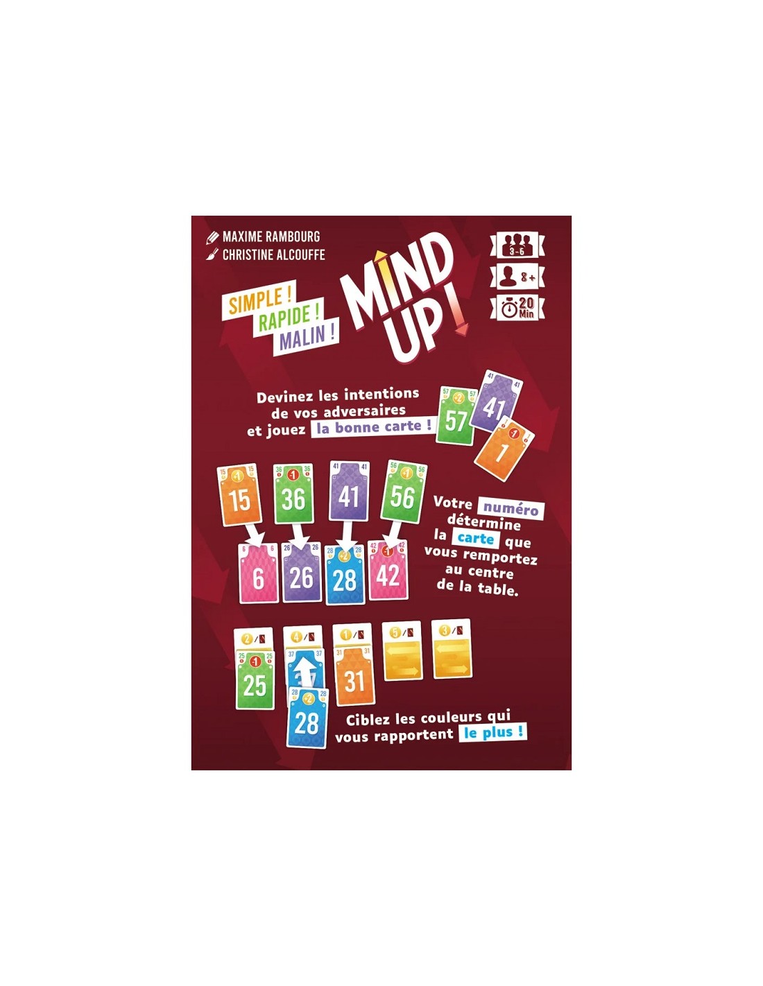 Derrière son immédiateté et sa grande simplicté d’accès, Mind Up! dévoile au fil des parties de nombreuses subtilités : vos capacités à bien utiliser les cartes de votre main et à deviner quelles cartes vos adversaires convoitent feront la différence ! Après quelques parties, une règle optionnelle ajoutant des objectifs bonus permet d’ajouter encore un peu de piquant et de profondeur tactique au jeu.