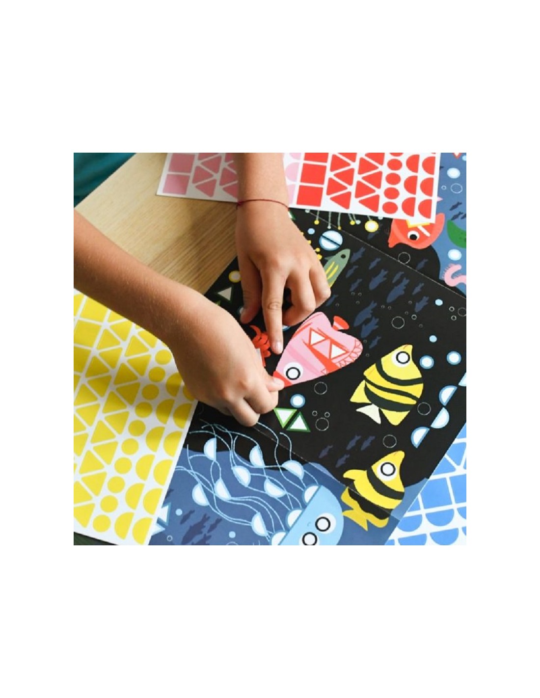 Les enfants collent les stickers sur un grand décor des fonds marins. Ils apprennent ainsi à reconnaître les formes et les couleurs comme en maternelle.