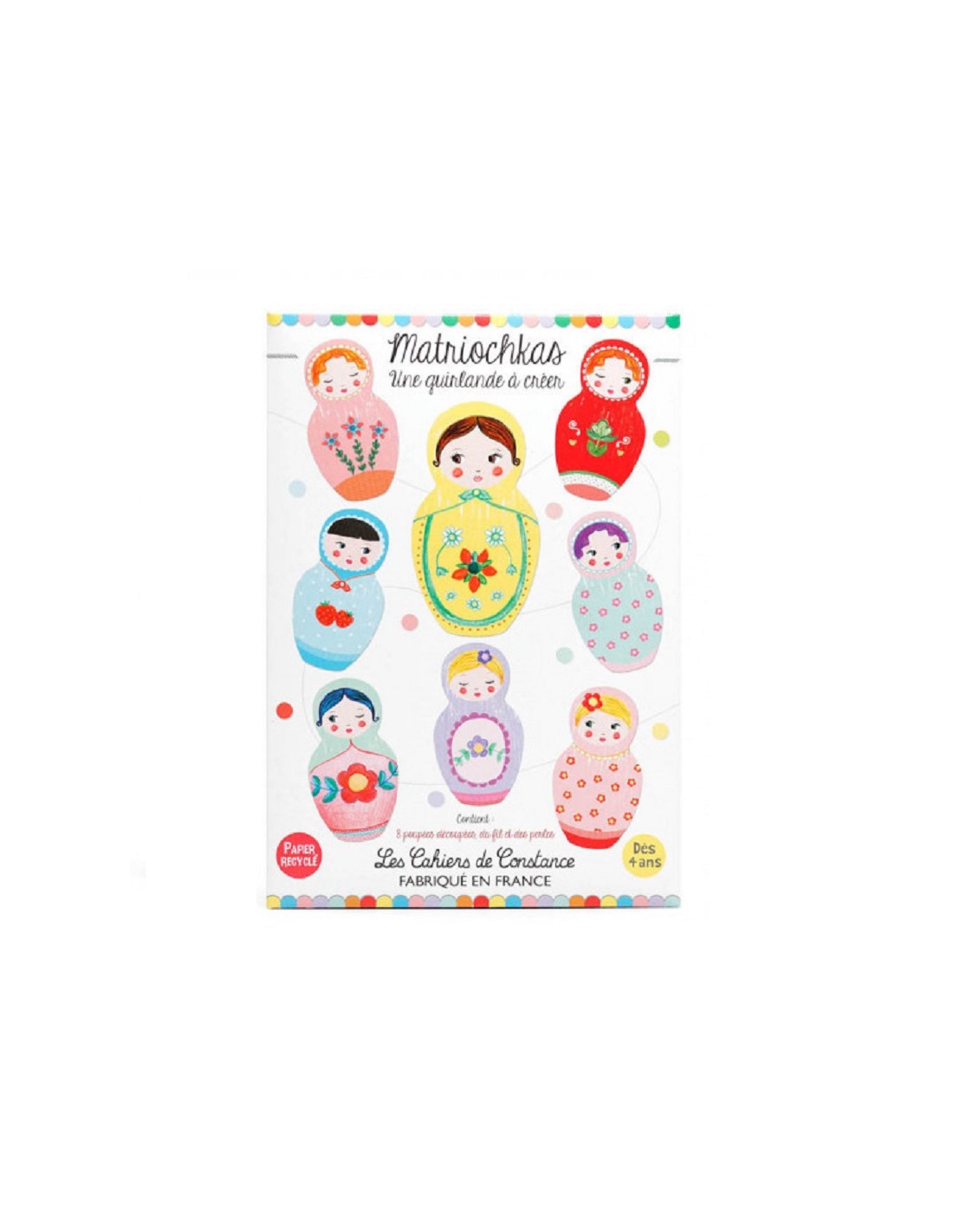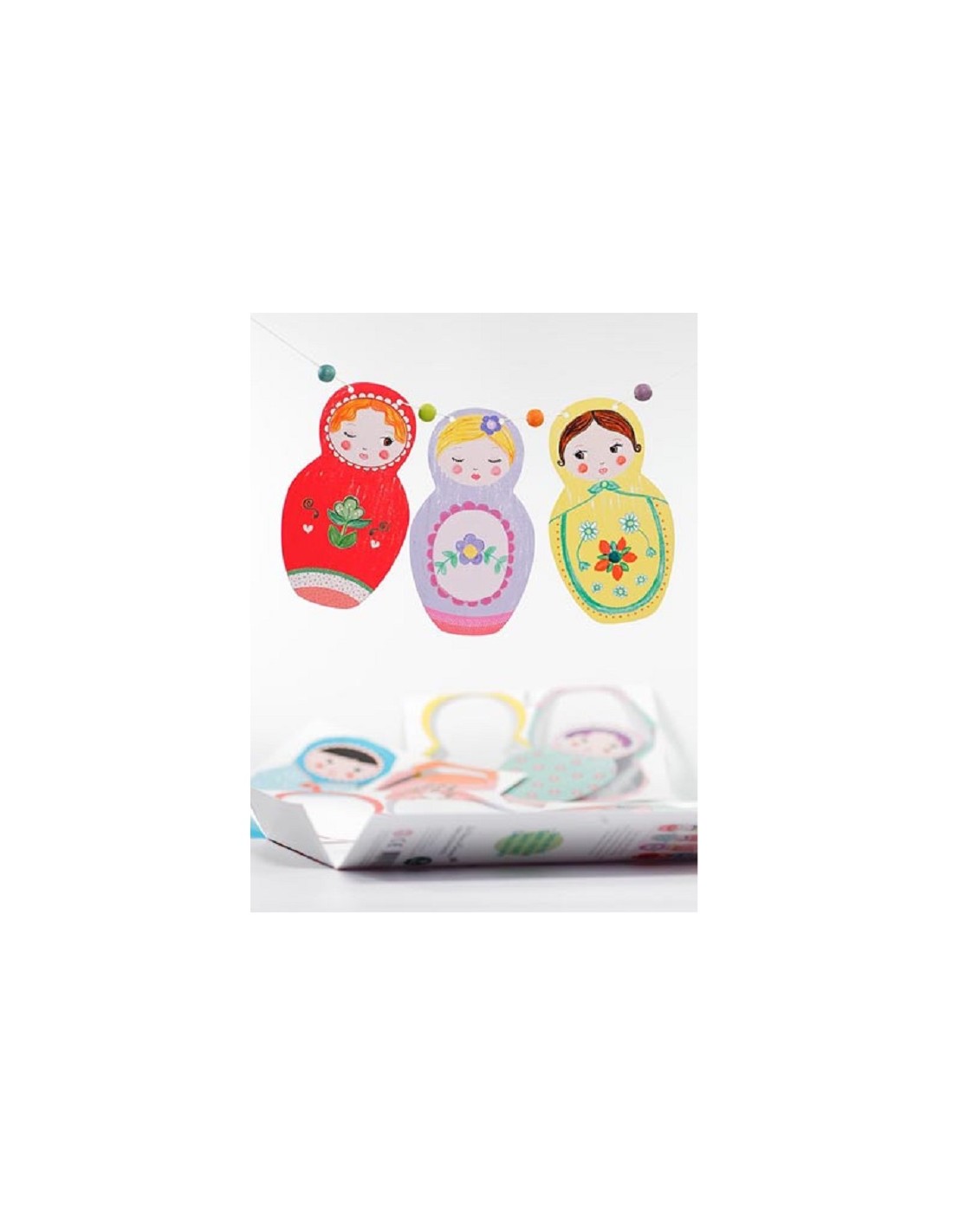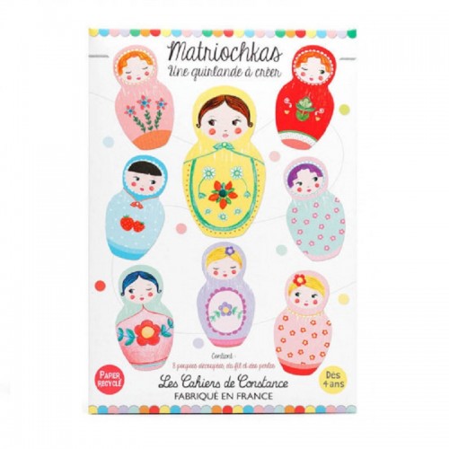 Ce kit contient 8 matriochkas en papier épais (poupées russes de hauteur 13 cm) à assembler avec du fil et des perles, afin de former une jolie guirlande de 1,5 m.