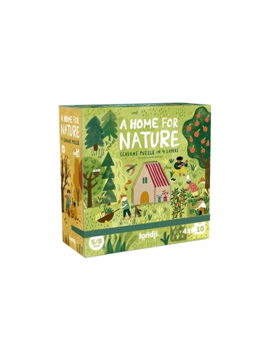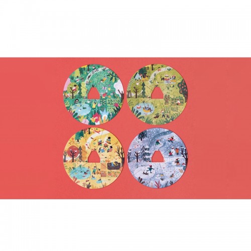 4 puzzles de 10 pièces, à monter les uns sur les autres pour découvrir comment la nature change à chaque saison, avec une maison en bois comme axe principal.