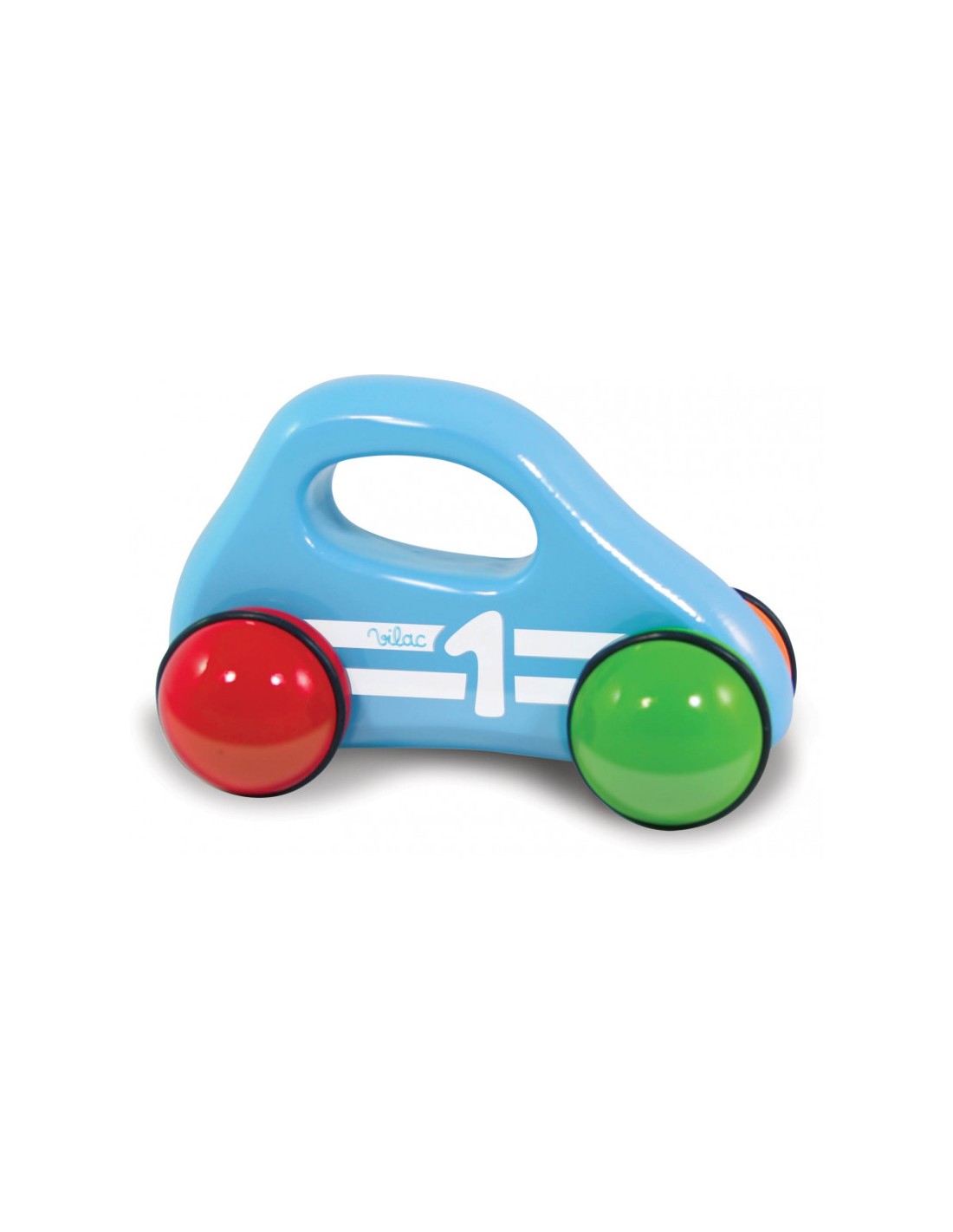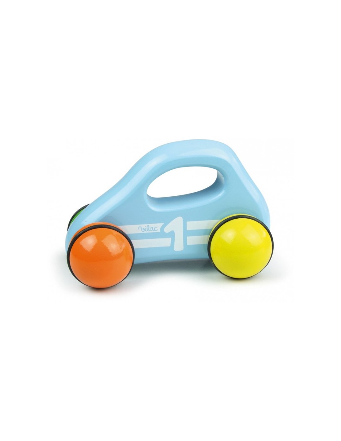 Voiture bleue en bois laqué pour les tout-petits avec sa poignée ergonomique pour une parfaite préhension.