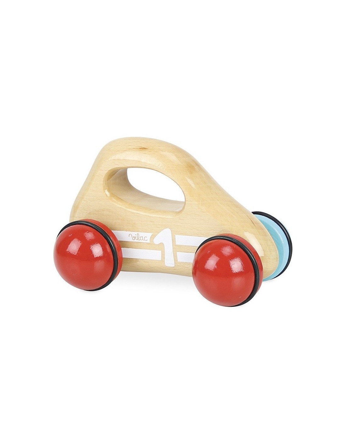 Voiture couleur naturelle en bois laqué pour les tout-petits avec sa poignée ergonomique pour une parfaite préhension.