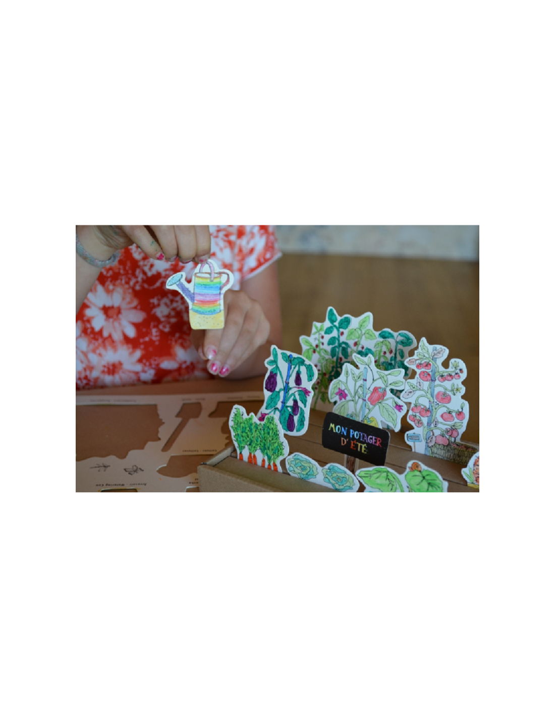 L’enfant s’amuse à mettre en couleur légumes et fleurs avant de les planter dans son potager.