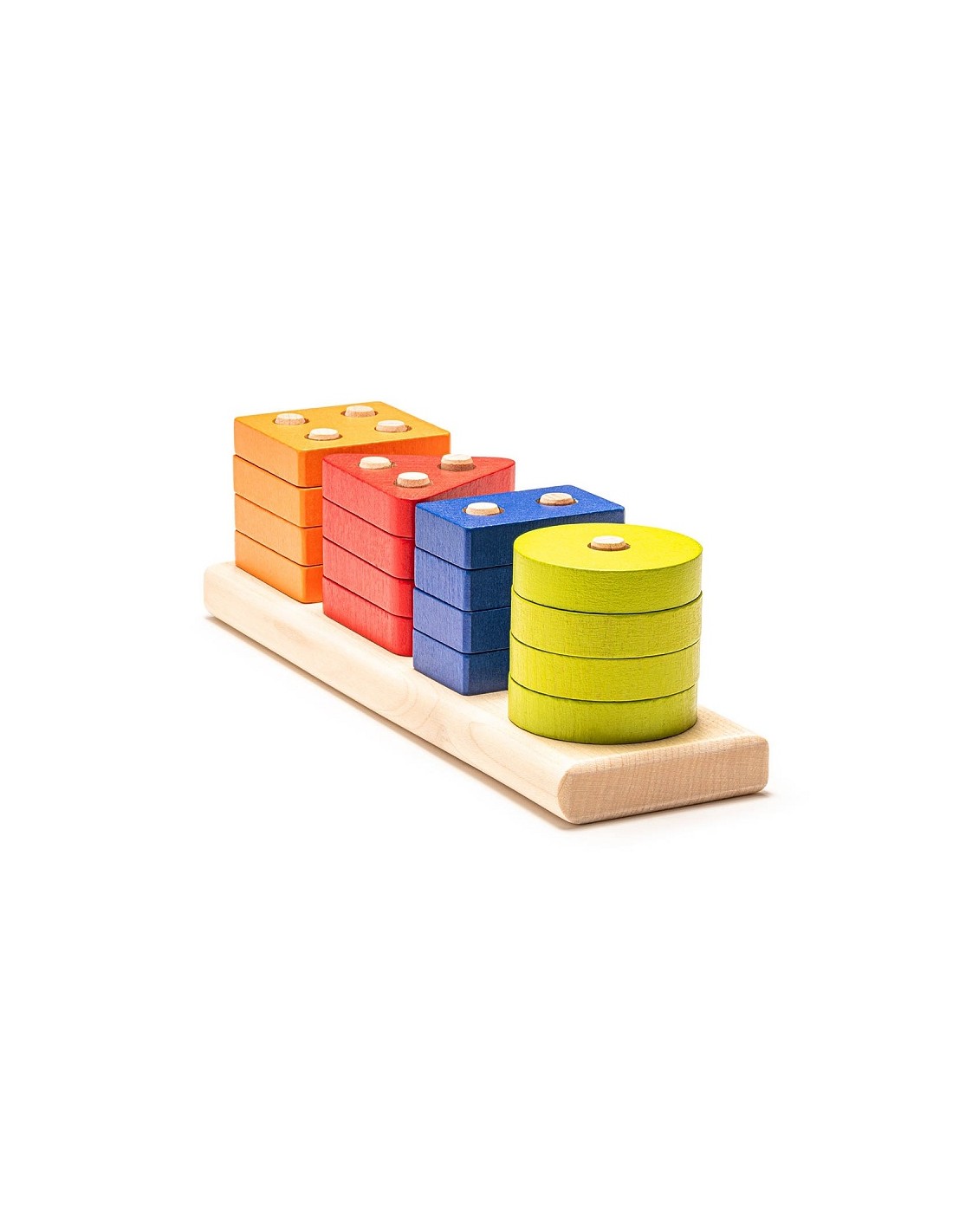 L'ensemble contient 16 pièces en bois de 4 formes géométriques et 4 couleurs différentes pour apprendre à l'enfant à trier, compter et classer!