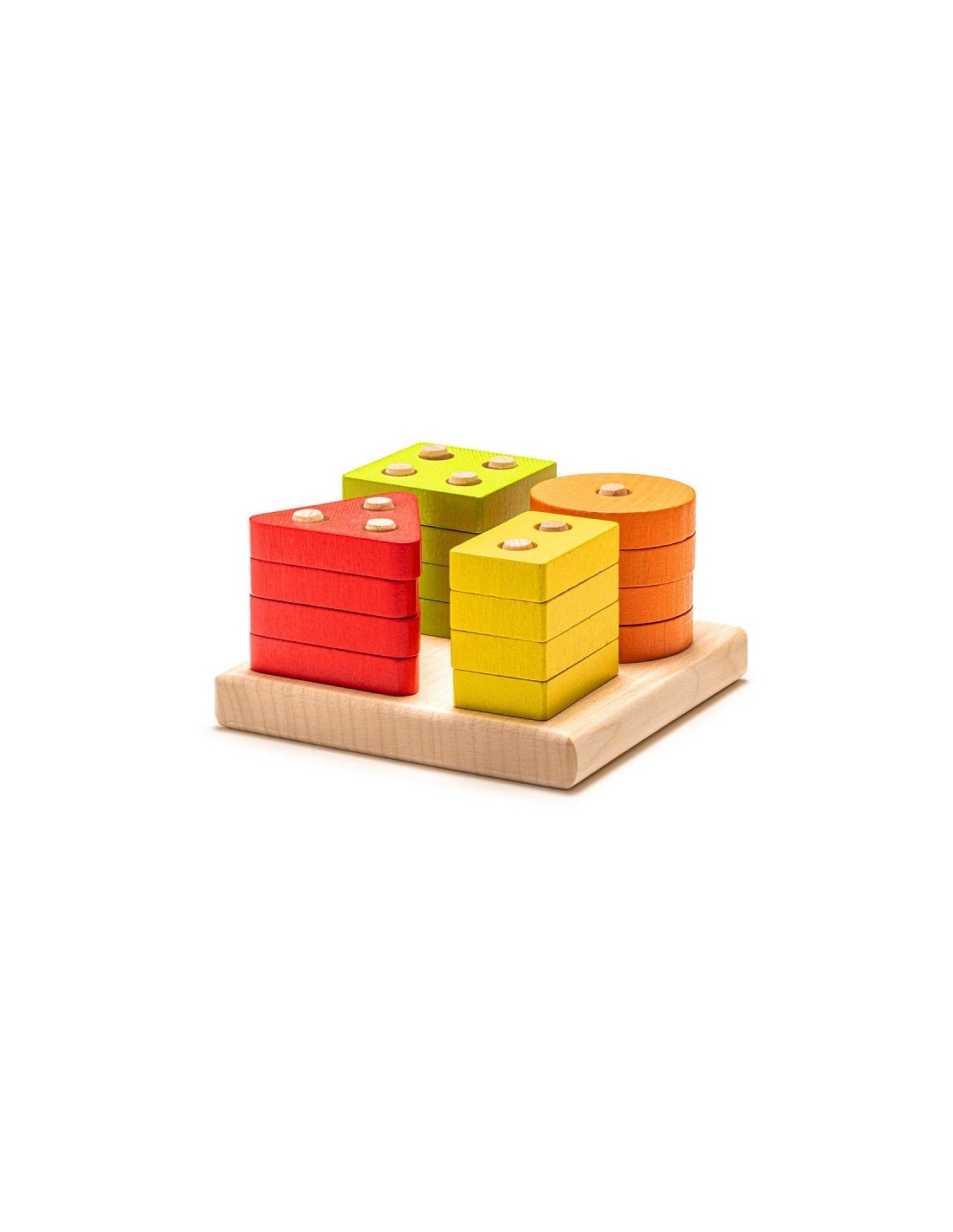 L'ensemble contient 16 pièces en bois de 4 formes géométriques et 4 couleurs différentes pour apprendre à l'enfant à trier, compter et classer!