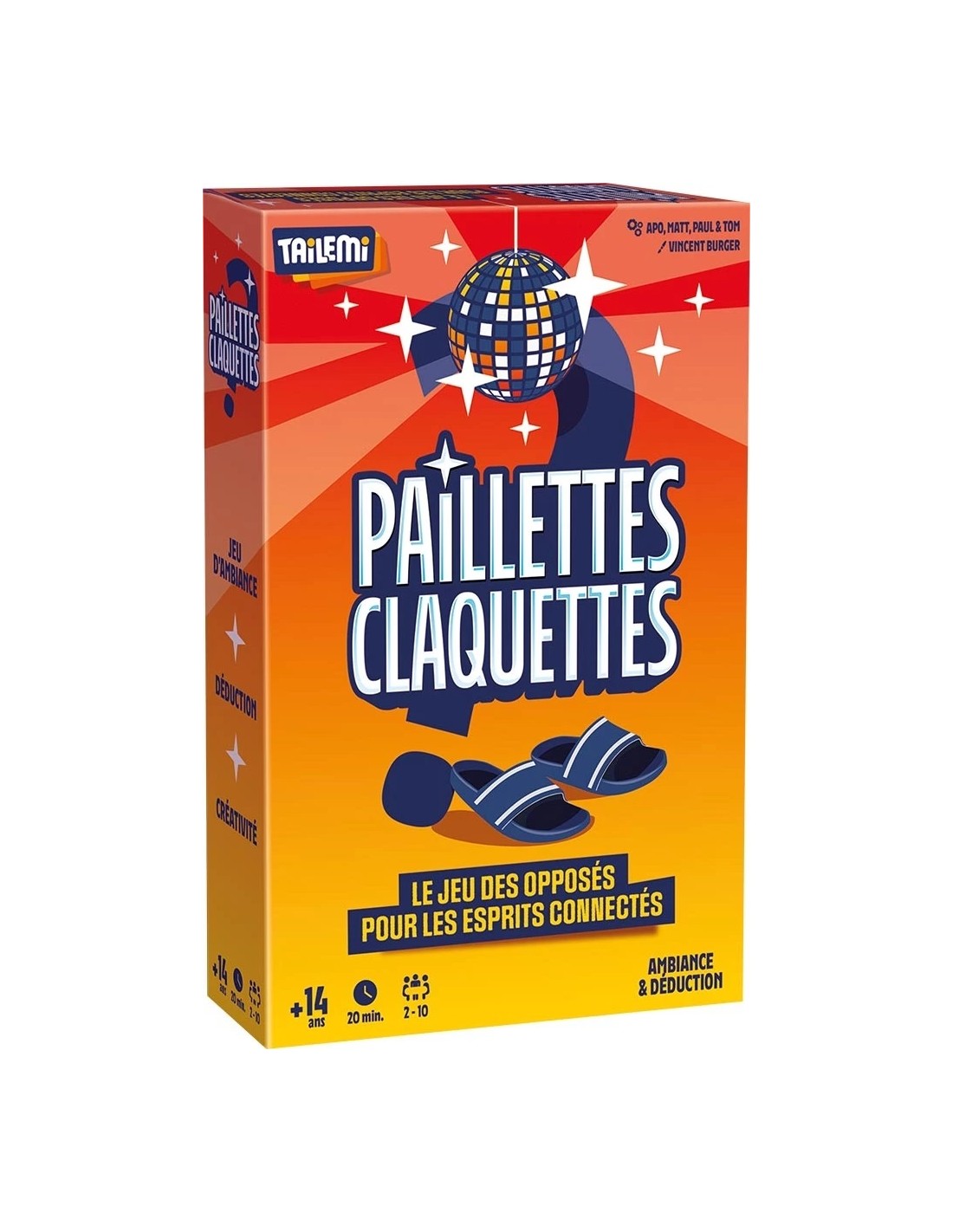 Paillettes Claquettes est un jeu d’ambiance et de déduction pour 2 à 10 joueurs.
