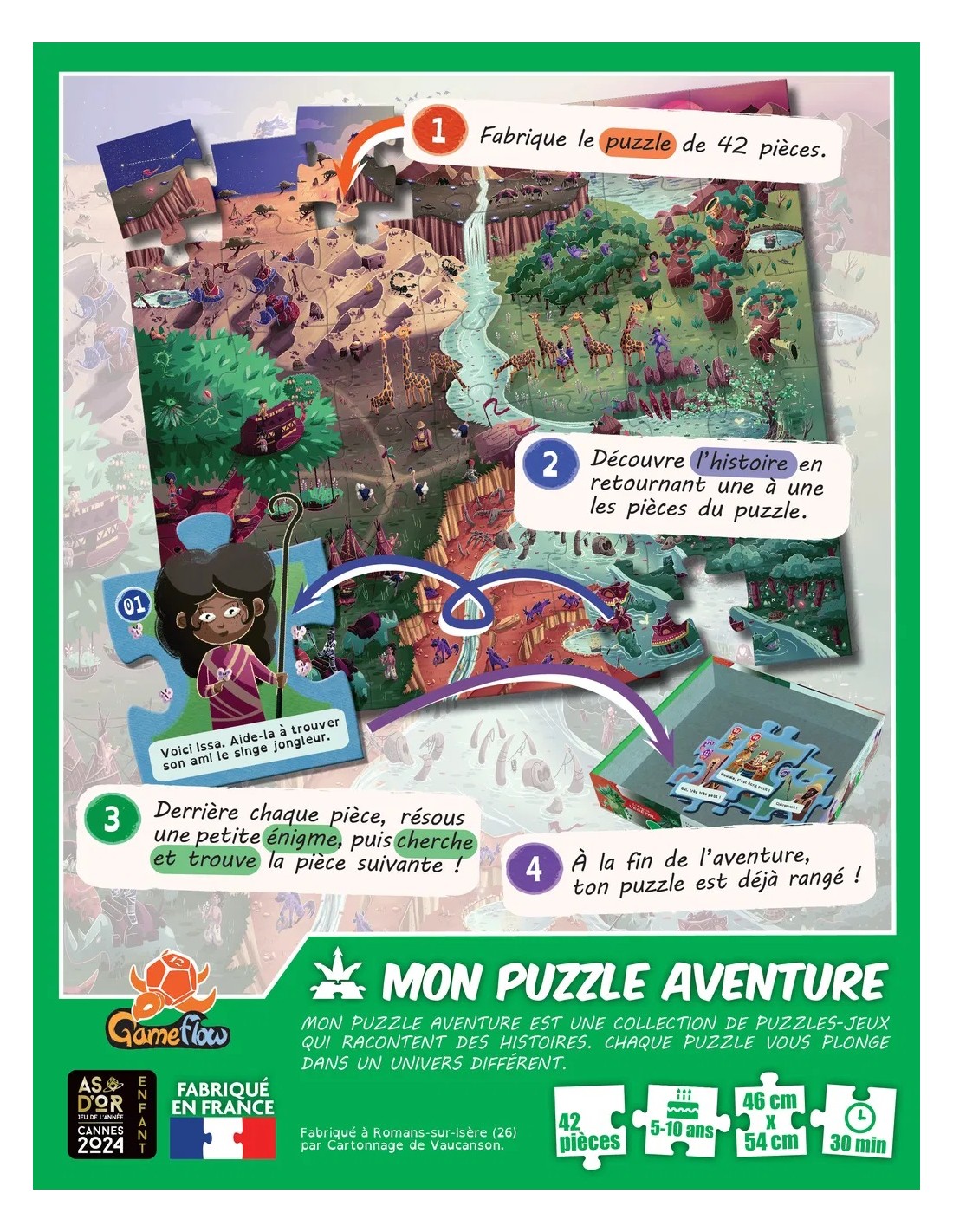La gamme Mon Puzzle Aventure est une réinvention captivante du classique jeu de puzzle. Tout commence par l'assemblage du puzzle, composé de 42 pièces. Une fois que toutes les pièces sont en place, l'aventure commence. Vous devez retirer les pièces dans un ordre précis pour révéler une histoire passionnante. Chaque nouvelle pièce vous donne un indice pour trouver la suivante.