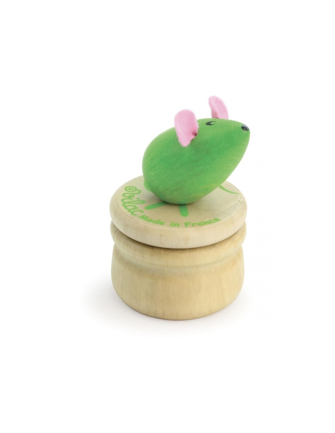 Boîte à dents décorée d'une petite souris verte et ses oreilles en feutrine rose.