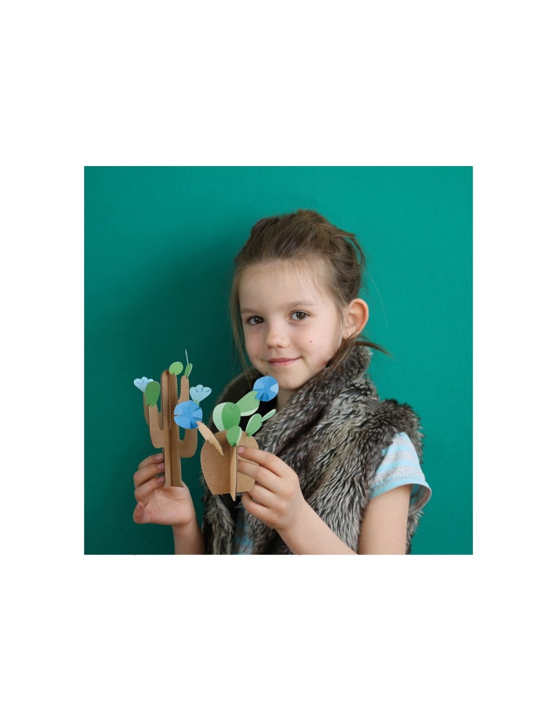 Un atelier créatif sans colle ni ciseaux. Grâce aux petits doigts minutieux des enfants, chaque cactus en carton se verra coiffé de jolies pousses et fleurs en papier.