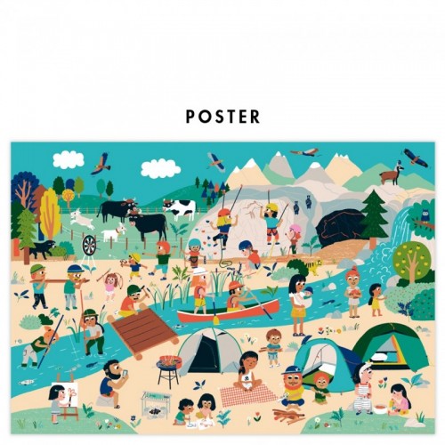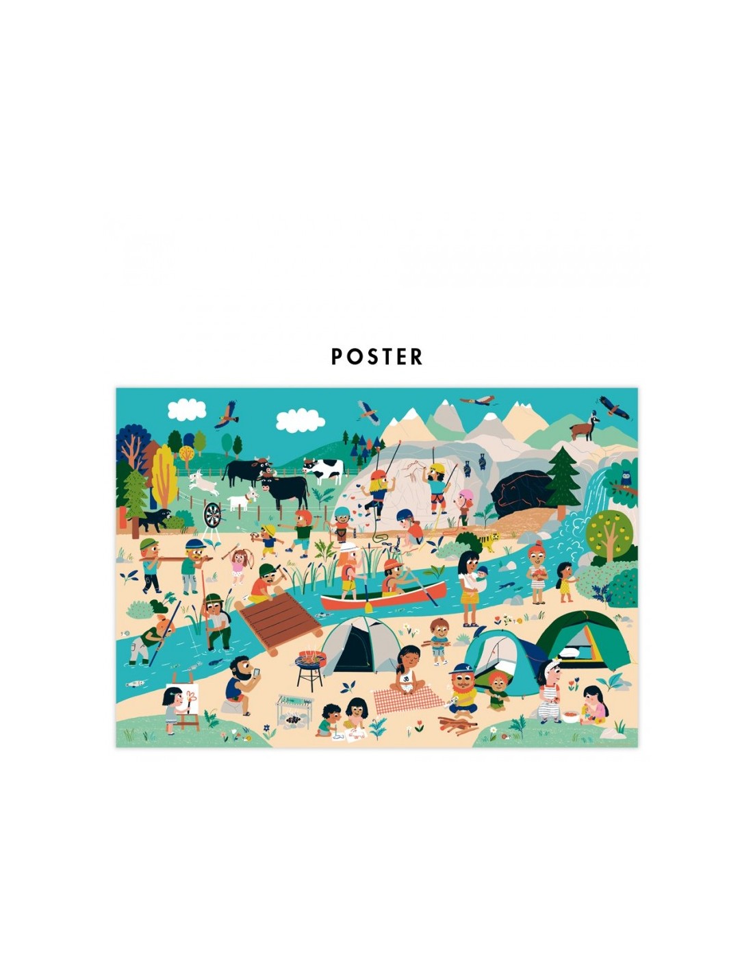 Un poster représentant une scène contemporaine illustre une scène dans la nature, chaque pièce du puzzle vient se superposer à cette illustration et transpose cette scène contemporaine au temps des Hommes préhistoriques… Un concept de puzzle unique et innovant !